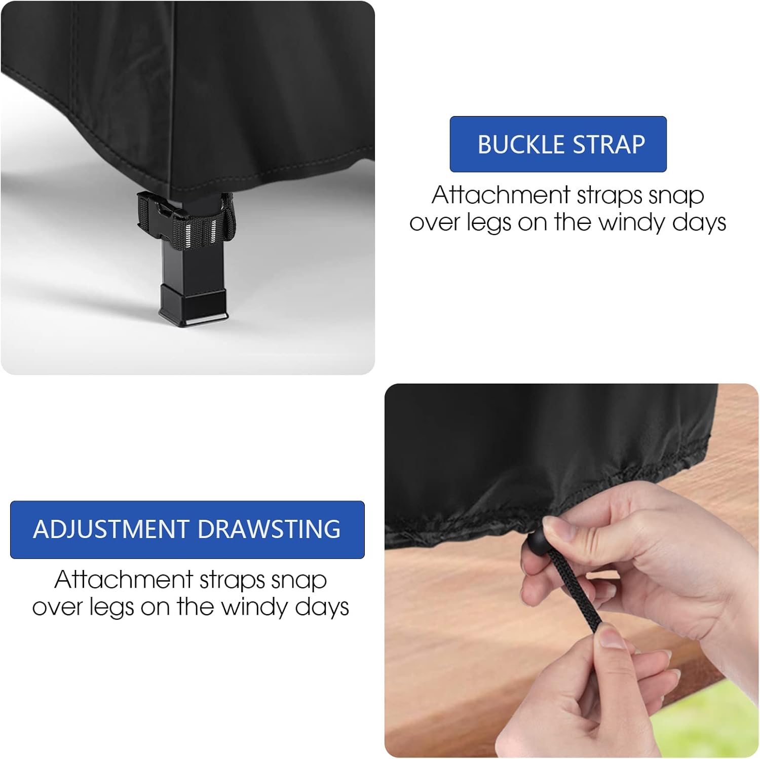 - Windproof: There is an adjustable drawstring and two velcros at the bottom of cover, which fits closely to the furniture to prevent the cover from being blown away by strong winds.