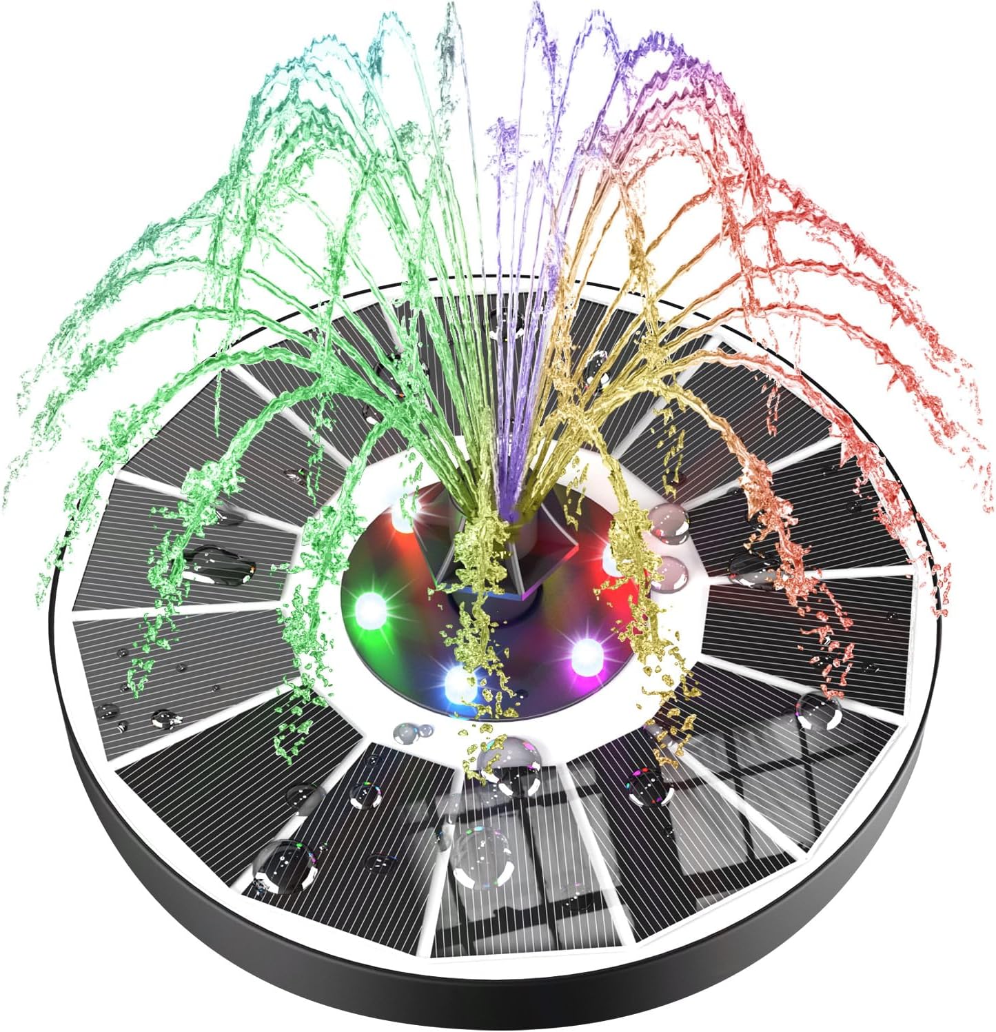 - 6 LED Solar Water Fountain: The solar fountain pump comes with a battery, it's can store electricity under direct sunlight during the day. The stored electricity can make the solar bird bath fountain automatically spray water and light up for up to 3-4h at night. RGB color auto-cycle setting makes your garden look more beautiful at night, it allows you to see the unique light water spray show when you get home from getting off work
