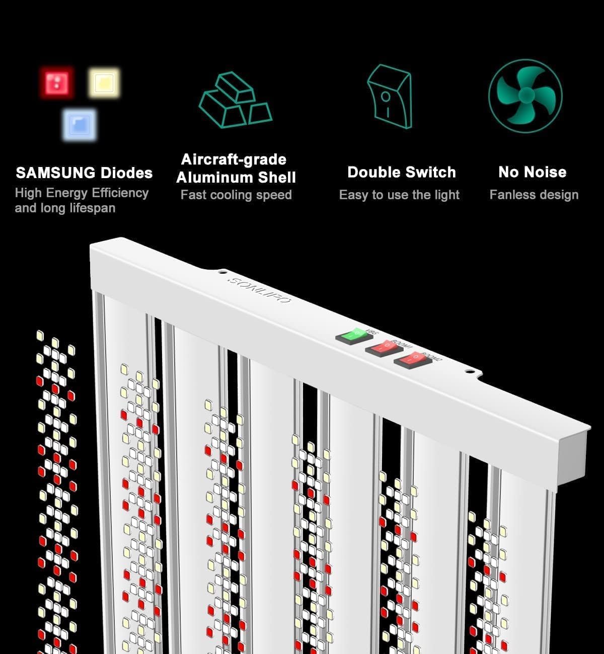 - VEG & Double BLOOM Switch : Aaccording to the growth and yield of plants, Sonlipo designed 3 switches, VEG, BLOOM and enhance BLOOM, to facilitate the control of red and blue light spectrum, to make the roots and stalks of plants grow thicker, and prevent them from growing taller in vain. Enhance RED light, can greatly increases the size and number of flowers to maximize the yield of the plant, maximum 2.9 g/w.