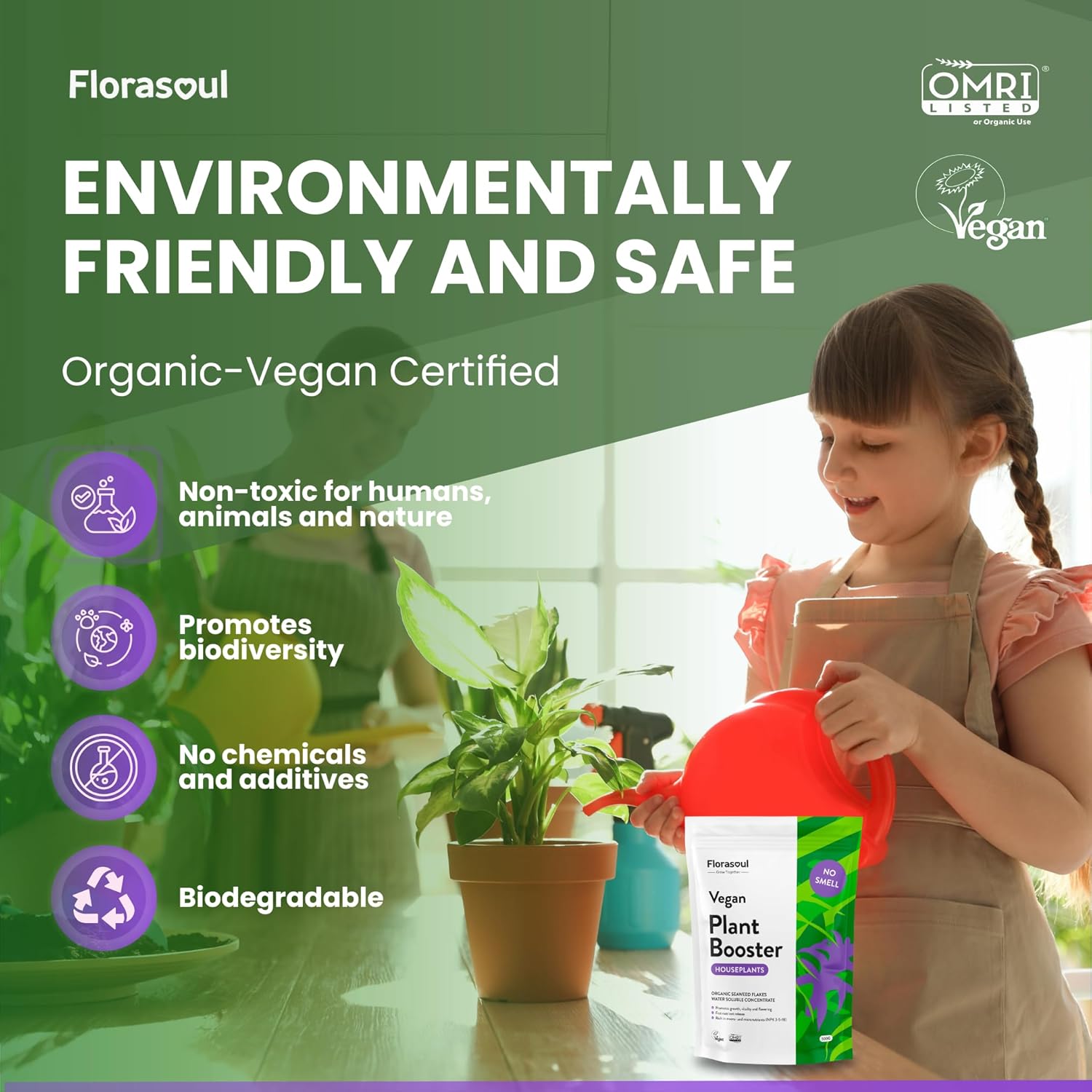 PLANT BOOSTER Indoor Plant Food Water Soluble Flakes Organic Seaweed Fertilizer NO SMELL Best House Plant Feed Eco Friendly, Certified Vegan Organic Plant Fertilizer 500g/350l
