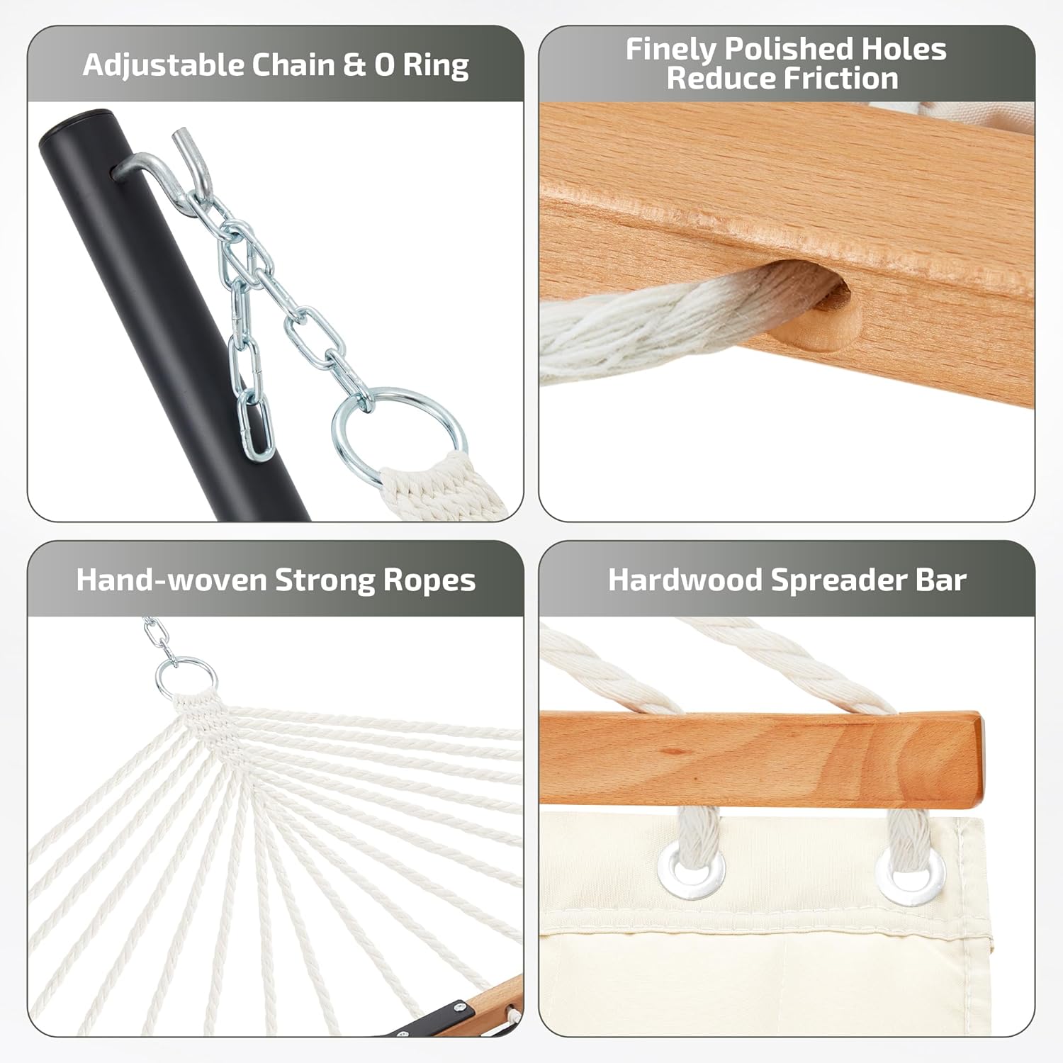 - ăCurved Spreader BarăThe angle of the curved bars make the center of gravity more stable when using. The countersunk spreader bar holes can reduce the friction between rope and wood which make the hammock stands the test of time.