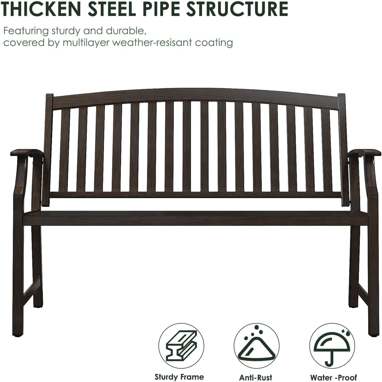 - Strong Structure: This sturdy, full-size patio bench is made of thickened steel pipes and rust free back and seat, wider and stronger armrests and backrest design makes you feel more comfortable. Max load capacity reach 660 lbs
