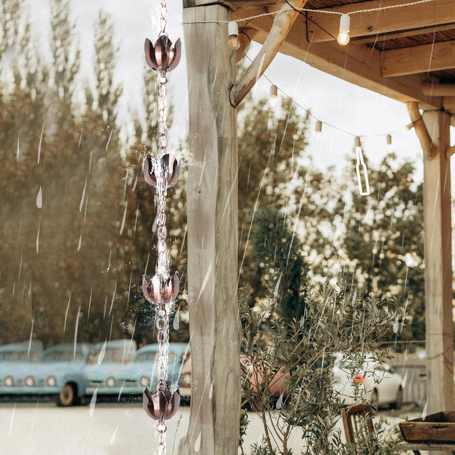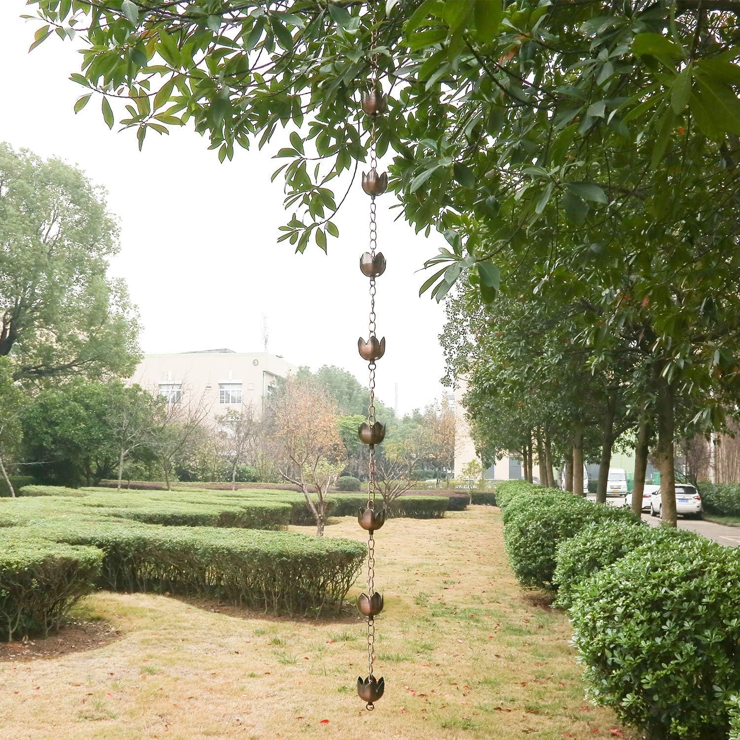 - Adjustable Rain Chain: The length is about 70 inches, the length can be adjusted by removing. Comes with 8 lotus shapes that are removed to adjust the length of the rain chain to fit your house and garden. Lotus-shaped rain chain decoration brings a mysterious feeling to people. When you sit in the garden and drink tea, the wind blowing in front of you makes the rain chain float gently in the air, adding luster to your garden
