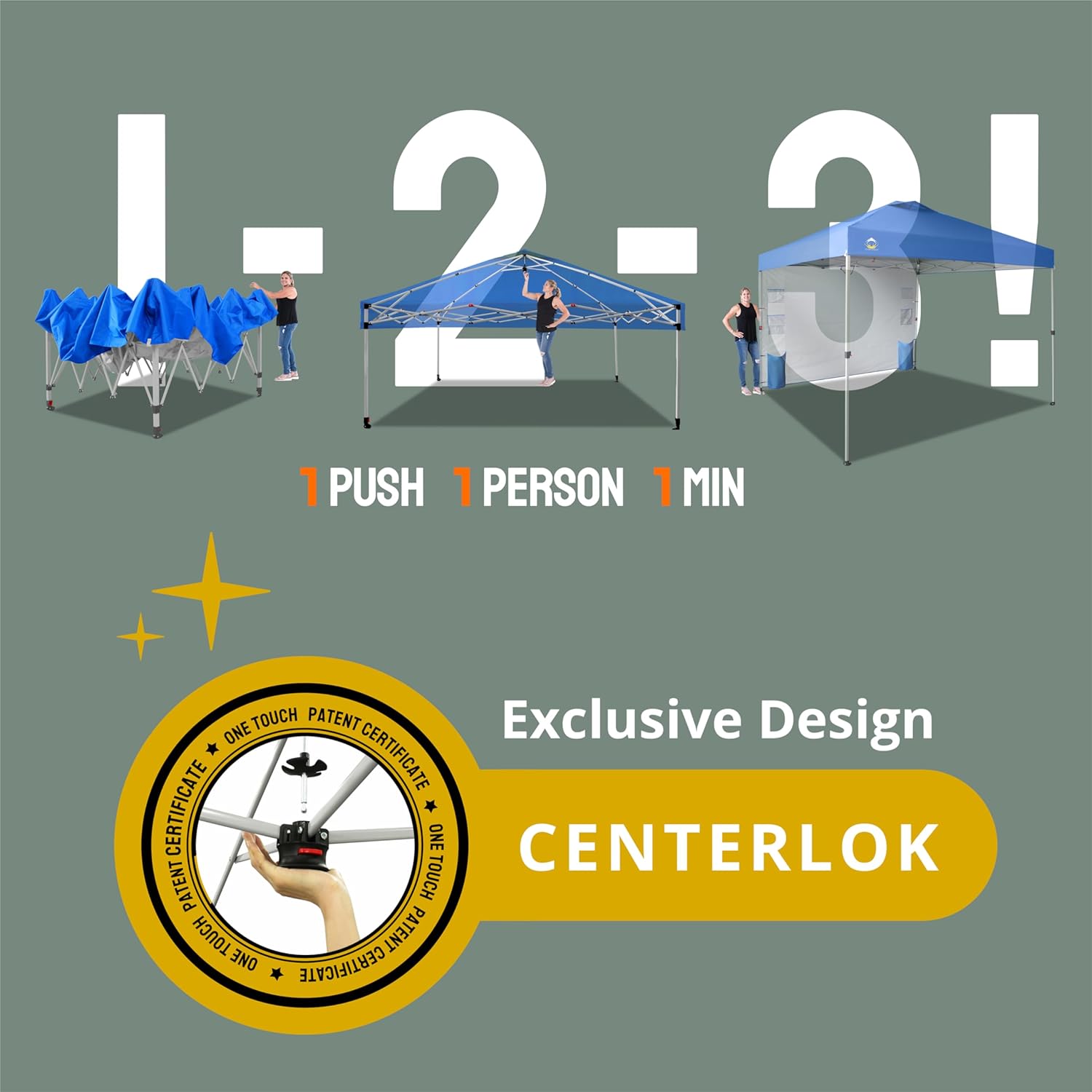 - ONE BUTTON EASY SET UP - Our 10x10 pop up canopy tent features patented one push center lock tech. With just a single push, the central hub locks the poles in place. Designed for the next generation, this outdoor canopy for patio can be set up by two people in seconds without any tools. Three adjustable height settings with soft, pinch-free buttons ensure convenience and safety, making it perfect for camping, beach outings, craft fairs, tailgating, farmer markets, outdoor BBQs, and more