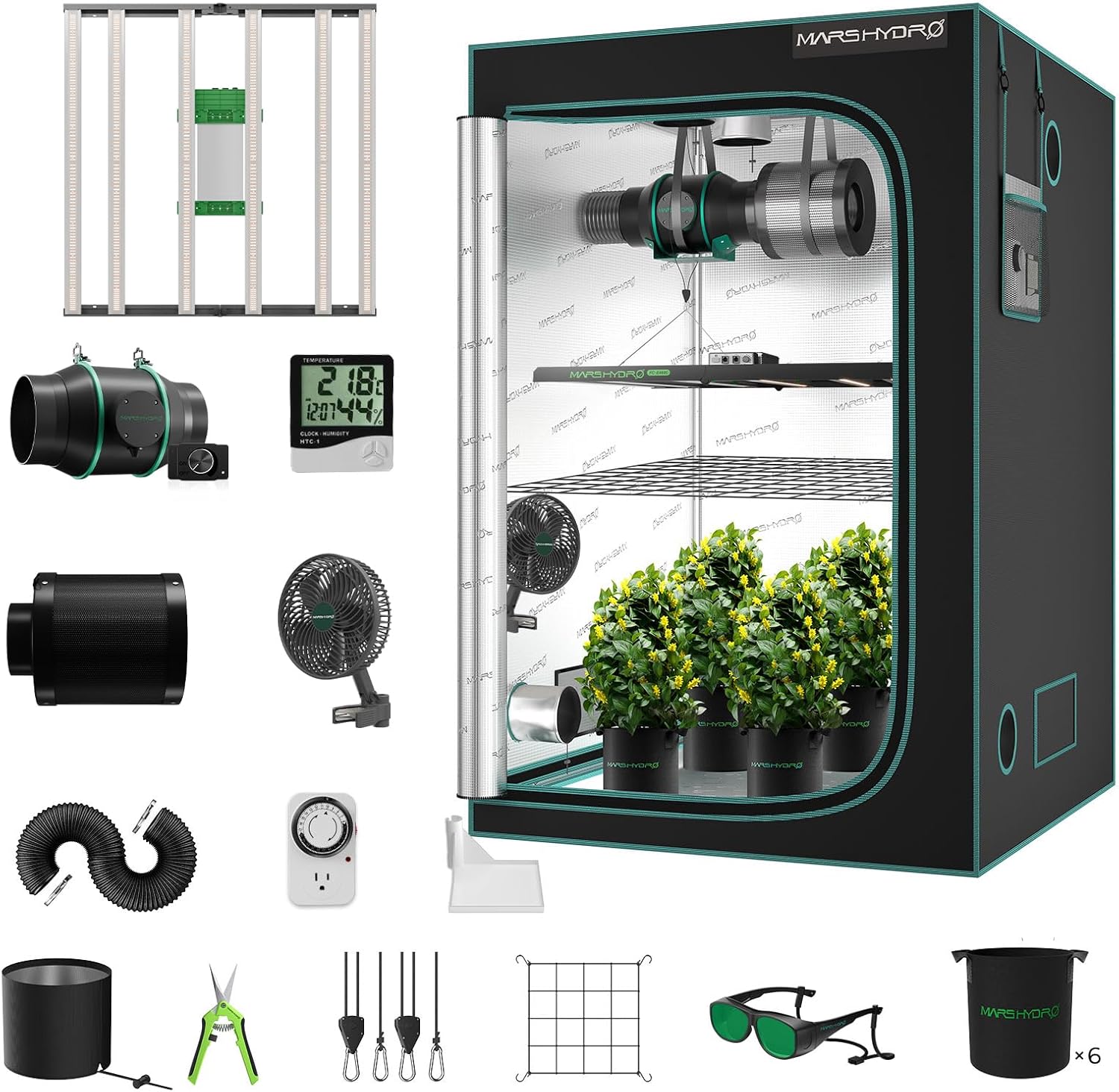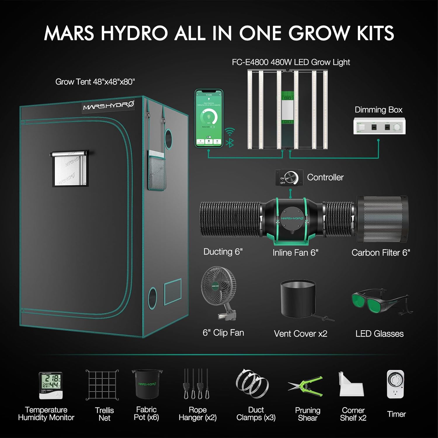 MARS HYDRO 4x4 Smart Grow Tent Kit Complete System,480W FC-E4800 APP WIFI Control Light 2646pcs LED,1680D High Reflective Mylar,with 6inch 32dB,402CFM Adjustable Ventilation Kit,10 Speed Grow Tent Fan
