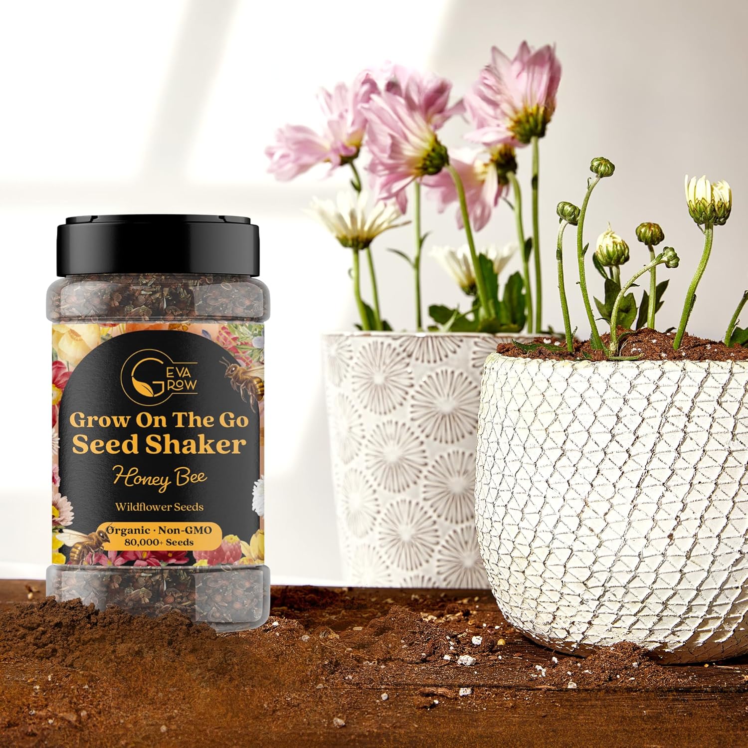 Mini Wildflower Seed Shaker – Honey Bee Wildflower Mix, by GevaGrow | Bulk 90,000+ Seeds | Pollinator Bee Attracting Flower Seeds for Planting in Pots & Outdoor Gardens | No Messy Packets