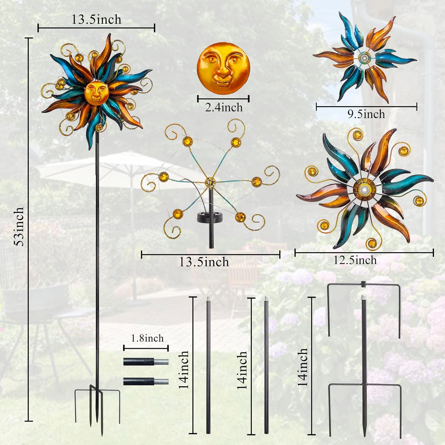 - Unique Design: Sun face wind spinner design with double "sunlight" blades and solar lights. As it spins with the breeze, shining, a bright lights on the wind spinner adds more charm to you garden