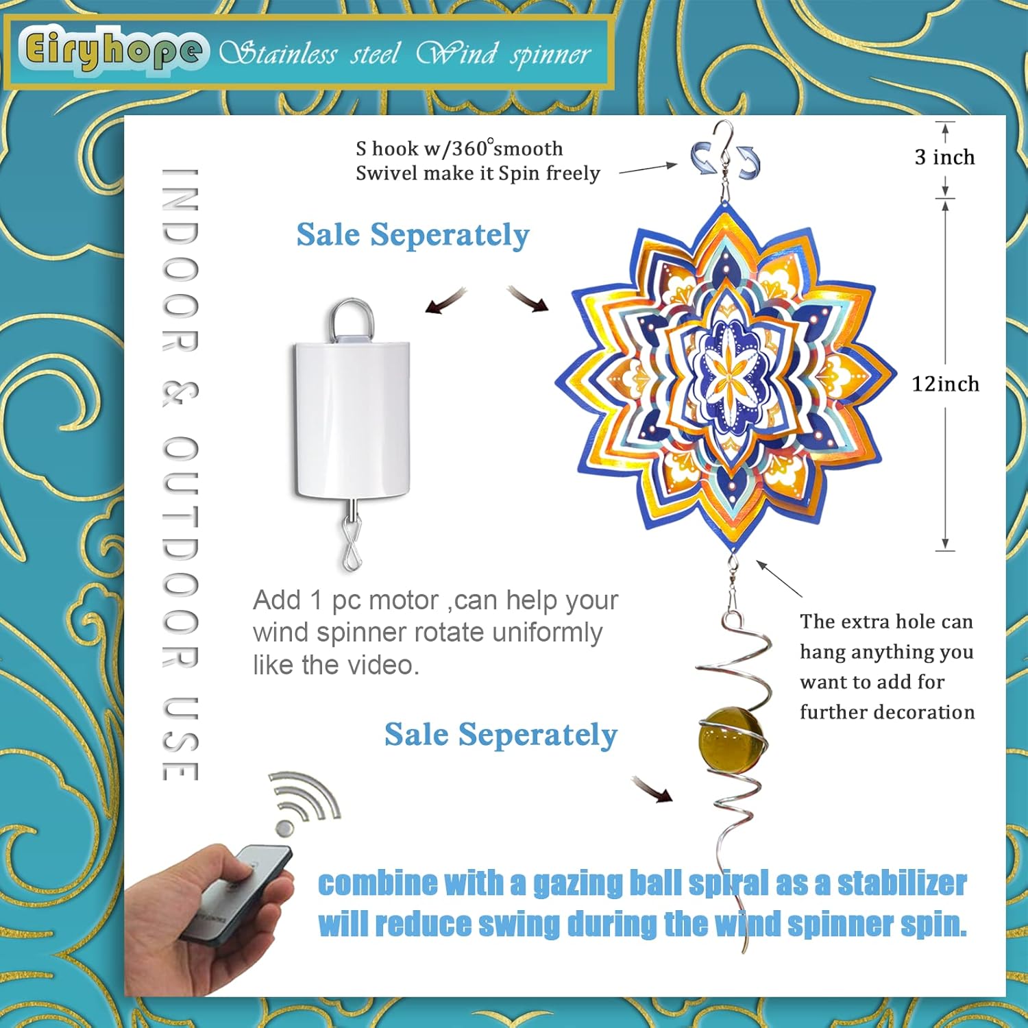 - 【Premium Kinetic Wind Spinner】Our quality wind spinner is made with high quality and durable materials. Made of stainless steel material, laser cut, hand polished and painted with epoxy protection, this stainless steel wind spinner is one of the best metal wind spinners, highly weather resistant, rust resistant and reflective. This quality outdoor decoration has incredible color and light reflections that add color, movement and beauty to indoor and outdoor spaces.