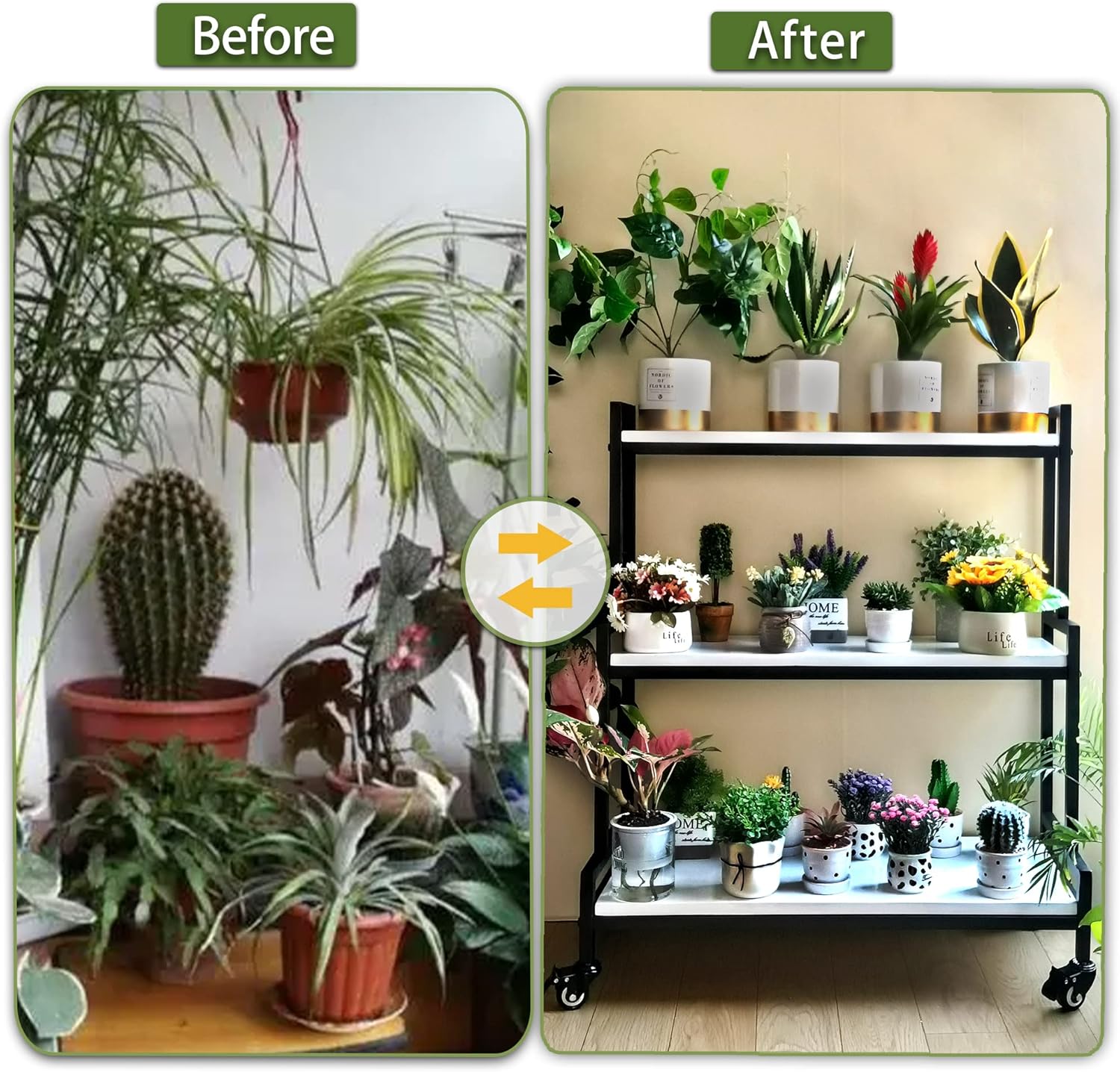 - 【Wheels with Fixed Lock】This plant stand comes with 4 detachable wheels with brakes, easy to 360°move the plant stand when you need to clean the floor or translate it to another place. Detachable wheels allow you to choose whether to use wheels or not according to your need.Moving your multiple plants outside in the spring/summer and rolling them back into your home for the fall/winter.