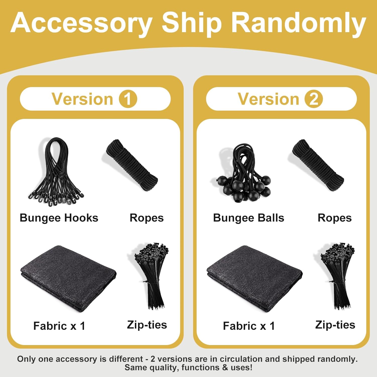 - Accessory Updated: Accessories have been updated from [Zip-ties, Ropes, Bungee Balls] to [Zip-ties, Ropes, Bungee Hooks]. Both versions are in circulation and will be shipped randomly. Easy to Install: With included grommets on each sides every 2 ft space and fixing accessories, you can easily attach the pergola shade cover to various structures while ensuring uniform stress. Whether you're looking to cover your backyard, carport, or playground, you can have it up and providing shade in no time