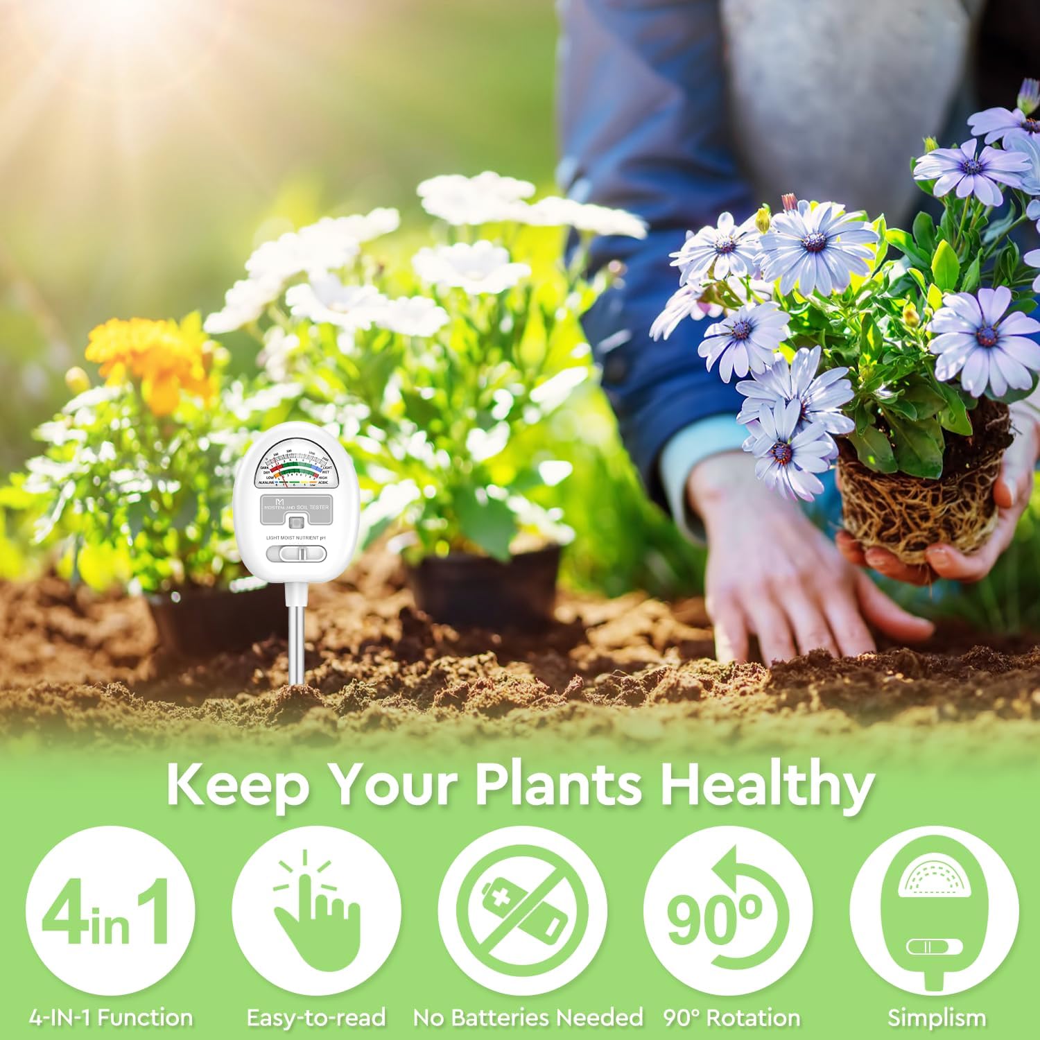 - Comprehensive and Professional: 4-in-1 Soil Tester, better sense the Moisture/Light/Nutrient/pH of the soil, and take better care of our plants. The soil meter helps to diagnose the soil conditions, so you can apply proper water, fertilizer, and light to your plants, and enjoy the joy of harvest and lushness faster.
