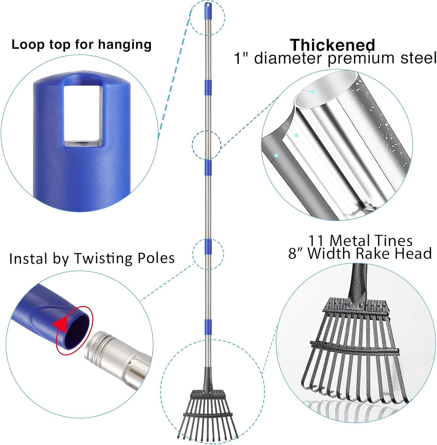 Rake for Leaves, 8" Wide 11 Tines Small Metal Hand Garden Adjustable Lawn Yard Shrub Kids Leaf Rake Heavy Duty Garden Tool for Gardening