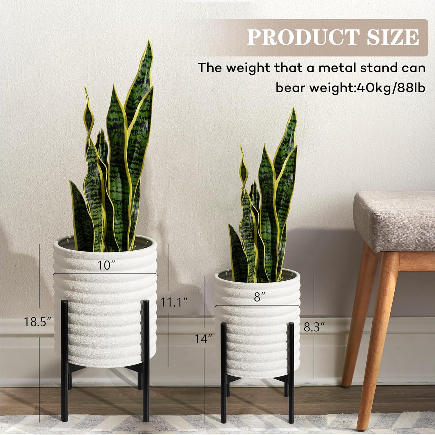 Oakrain Plants Pots with Stand, Set of 2 Indoor Planter Pots, Mid-Century Decorative Metal Flower Pots with Drainage for Living Room, Office, Garden, Balcony, 8"&10", White