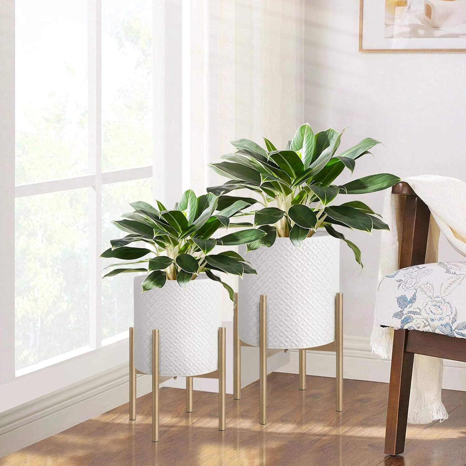 - Mid-Century Metal Planters: Featuring a sleek gold metal stand and white metal flower pot with geometric accents, these planters embody mid-century minimalism. Their timeless design makes them a perfect fit for any style of decor.