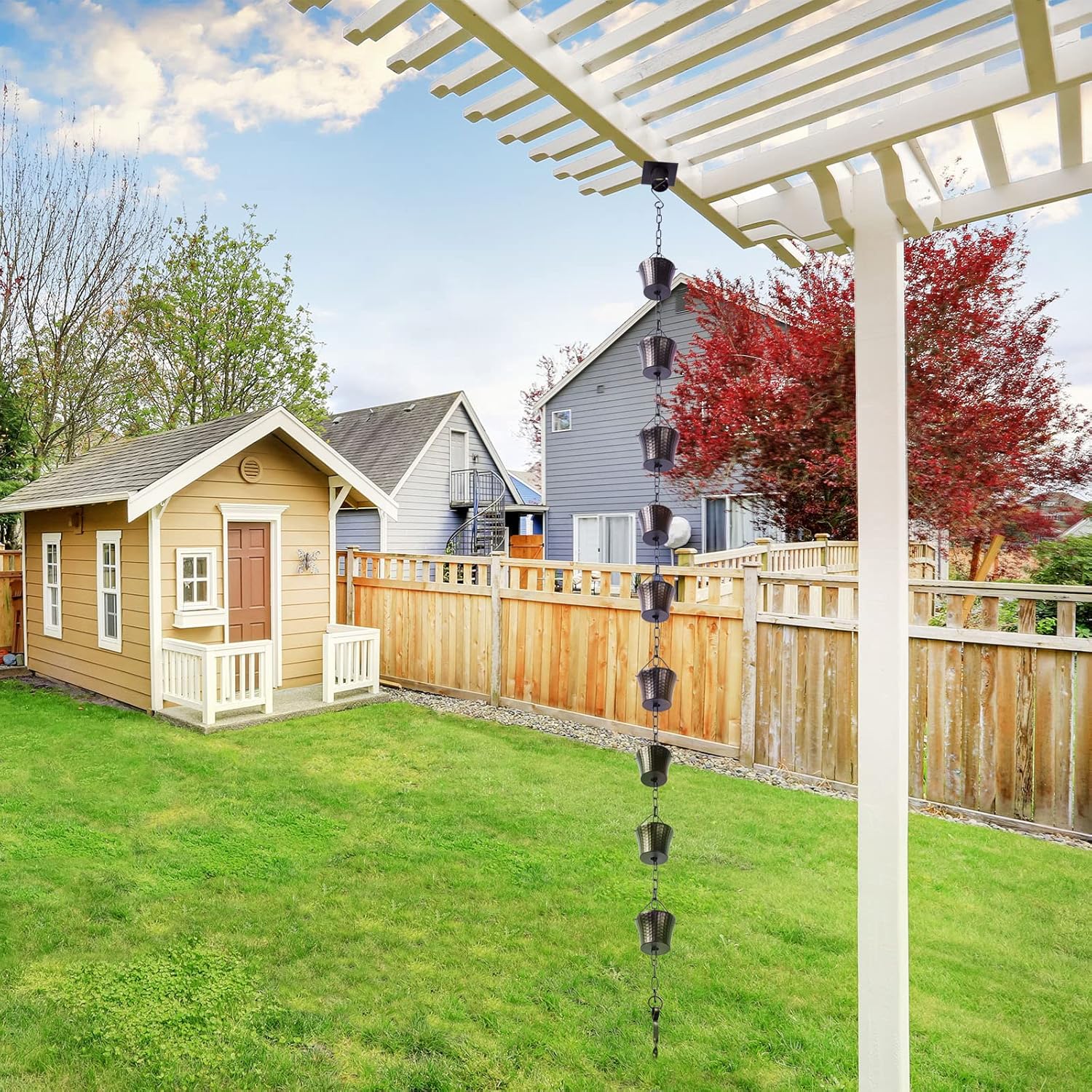 - Classic Looking Design:The standard length of the gutter rain chains is 8.5 FT. The rain chain is made of larger size of 14 CUP,combined with each other, so beautiful that water flows down each cup on the rain chains, creating a beautiful water feature.(✅❗NOTE:✅Single cup siez 3.95 inch wide, 3 inch high cylindrical cups and chains)