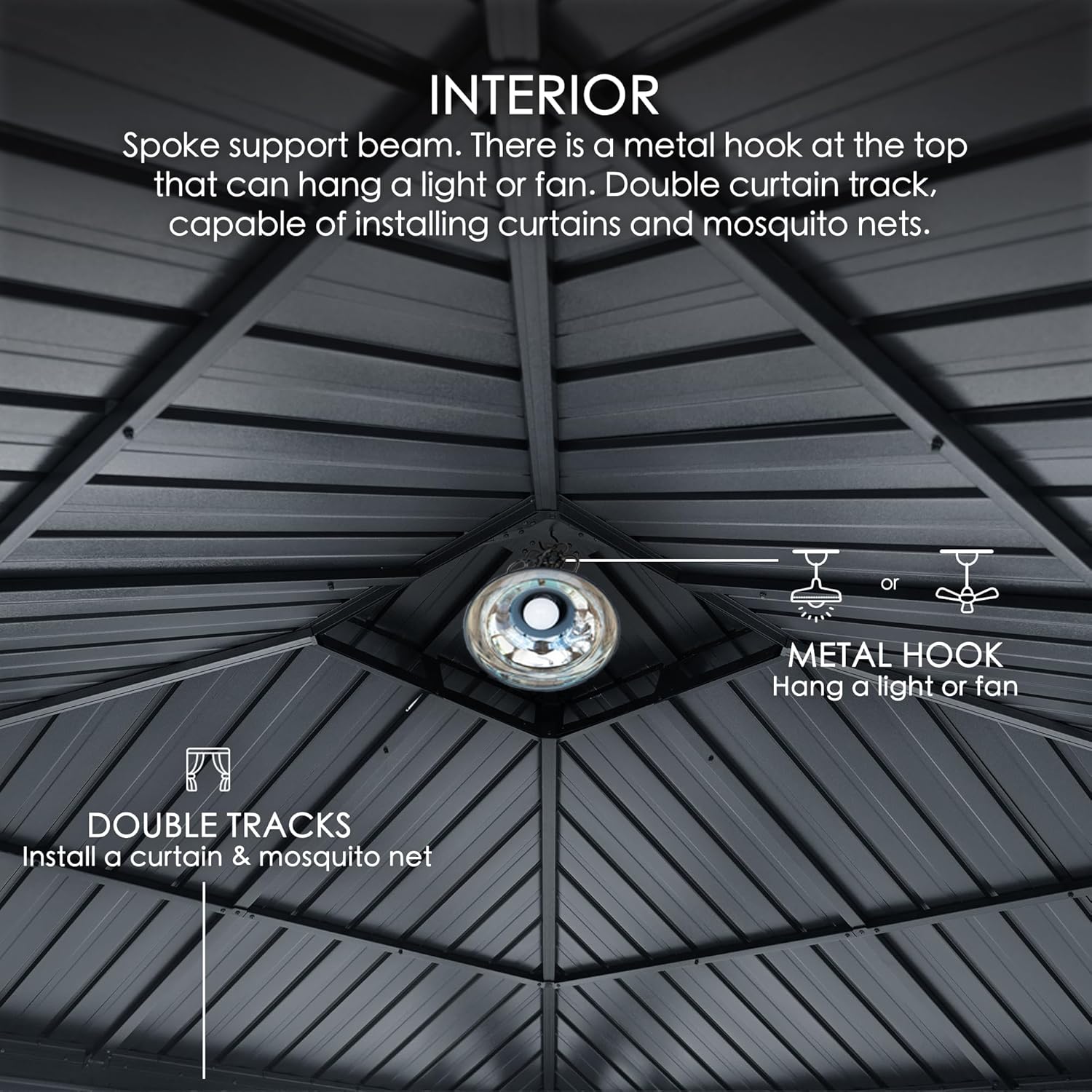 - âś…Two hooks have been specially crafted to accommodate fans or lights, enhancing the ambiance of your gazebo and making it a comfortable and inviting space.
