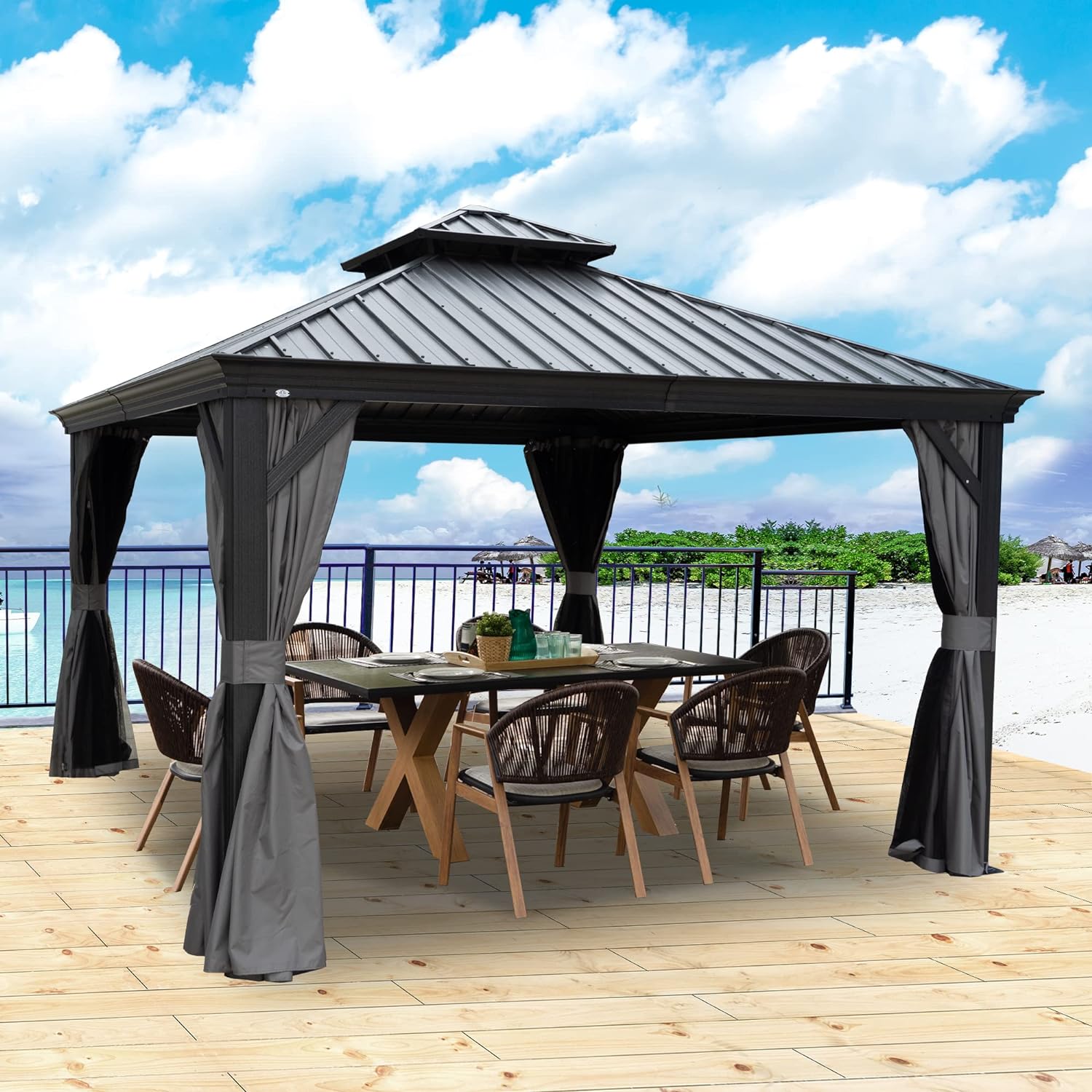 - âś…Curtains and Netting - The hardtop gazebo is equipped with fully enclosed, double-sided zippers, a dual-track system, and double-layer sidewalls. The gray polyester curtains and mesh ensure good ventilation and unobstructed views while offering protection from rain and UV rays, enhancing privacy. This setup creates a safe and comfortable environment for your family.