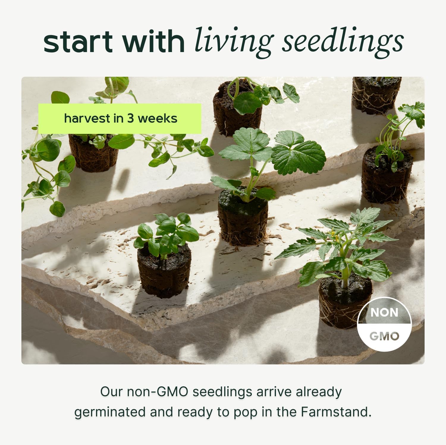 - 24 SEEDLING CREDITS: This starter kit includes a unique QR code on your packing slip with instructions to redeem 24 seedlings from our website. Your special seedling bundle includes the best veggies, leafy greens, herbs, fruits and lettuce of the season. These pesticide free, non-GMO, pre-grown plants will have you harvesting 3 weeks early and help ensure your success. Seedlings not shippable to U.S. outlying territories.