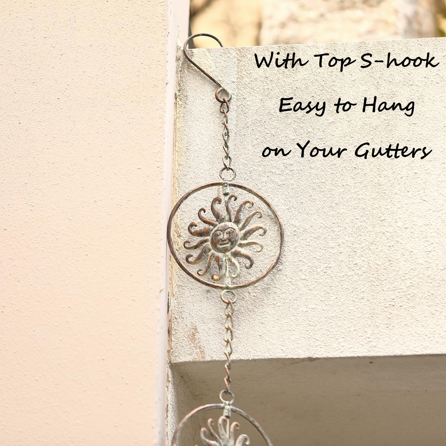 - ☀ Stylish Appearance - A distressed style rain chain downspouts adds visual appeal to your gutters. Connected by an iron chain to the circle and the sun smiley, this well-designed rain chime easily guides water from the gutters to the ground in style.
