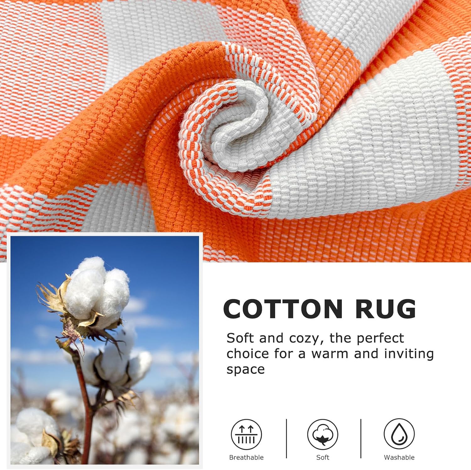 - Easy to Clean: This orange and white checkered rug is simple to maintain with machine wash or vacuuming to remove dirt. The rug is sturdy and can be tumble dried on low. Keep your door rug fresh and clean with minimal effort. NOTE: Cotton rugs normally shrink slightly after washing