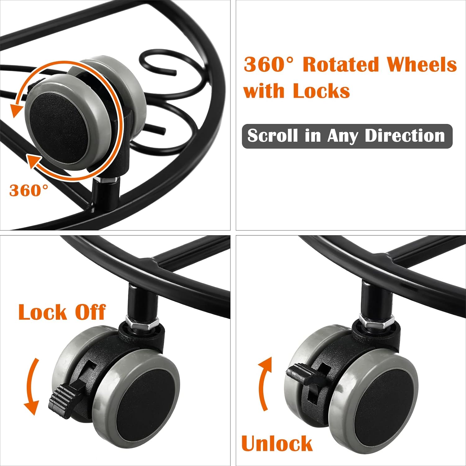 - 360° Rotated Wheels with Locks: The plant caddy has 4 wheels, 360°rotation, scroll in any direction. Every two wheels have a lock. When need fixed the pot, flip the lock on the wheel to keep it from rolling around on its own, when need move open the lock-up.
