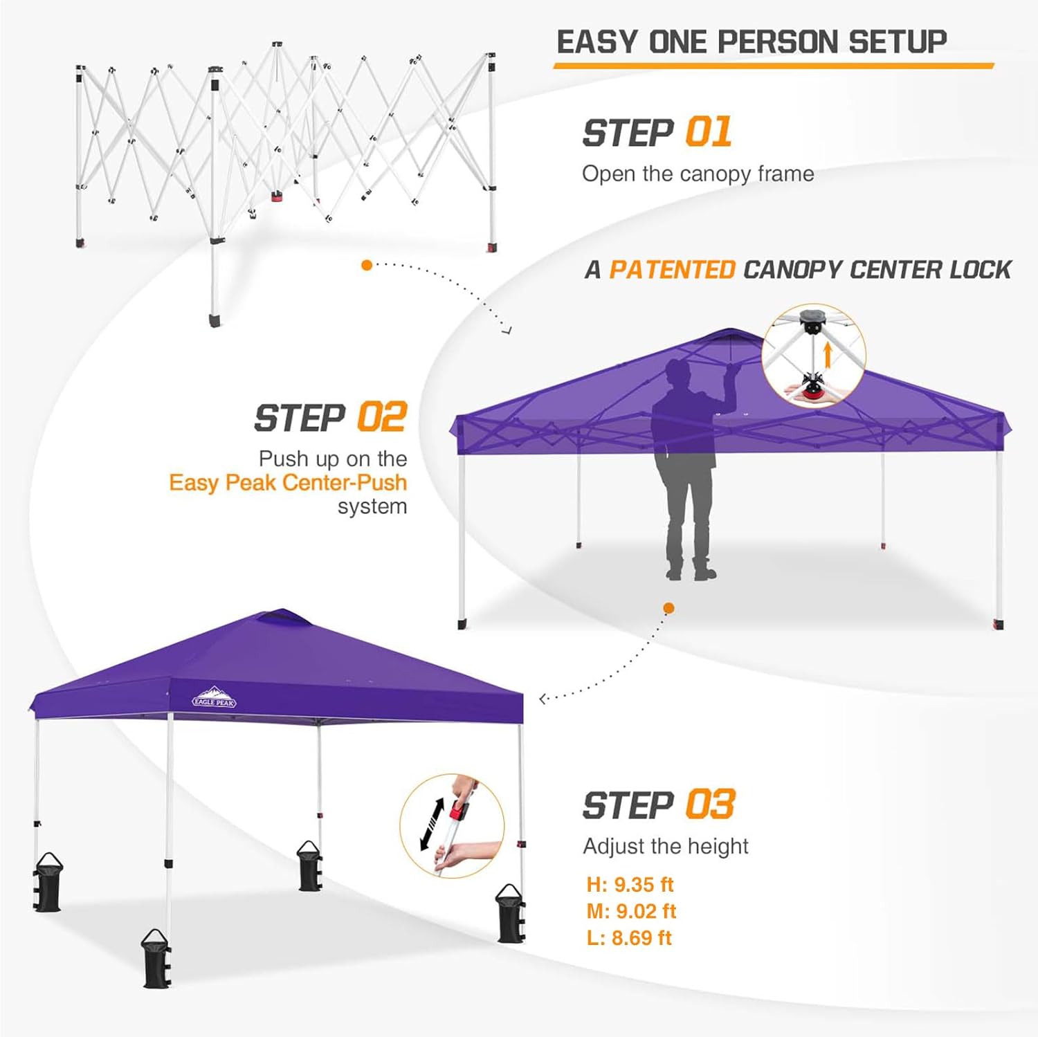 - EASY SETUP: This easy setup pop up canopy tent features the Peak Push system, a patented canopy center lock. The portable canopy requires no tools and easily opens and closes from the center in seconds. Its unique canopy tent center lock enables a quick, one person setup, letting you maximize outdoor time with minimal effort