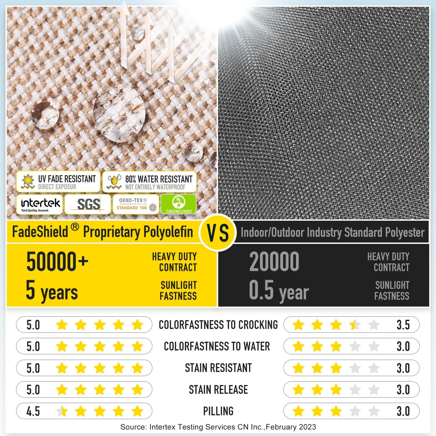 - 【FadeShield - UV Fade Resistant】FadeShield Proprietary Polyolefin are dependable indoor/outdoor performance fabrics, they can withstand 5 years of UV fade resistance, solution-dyed to make sure that each color is deeply ingrained in every fiber for continued vibrancy, even after heavy use. We recommend bringing it indoors when it rains or when not in use to preserve its lifespan and keep it looking beautiful.