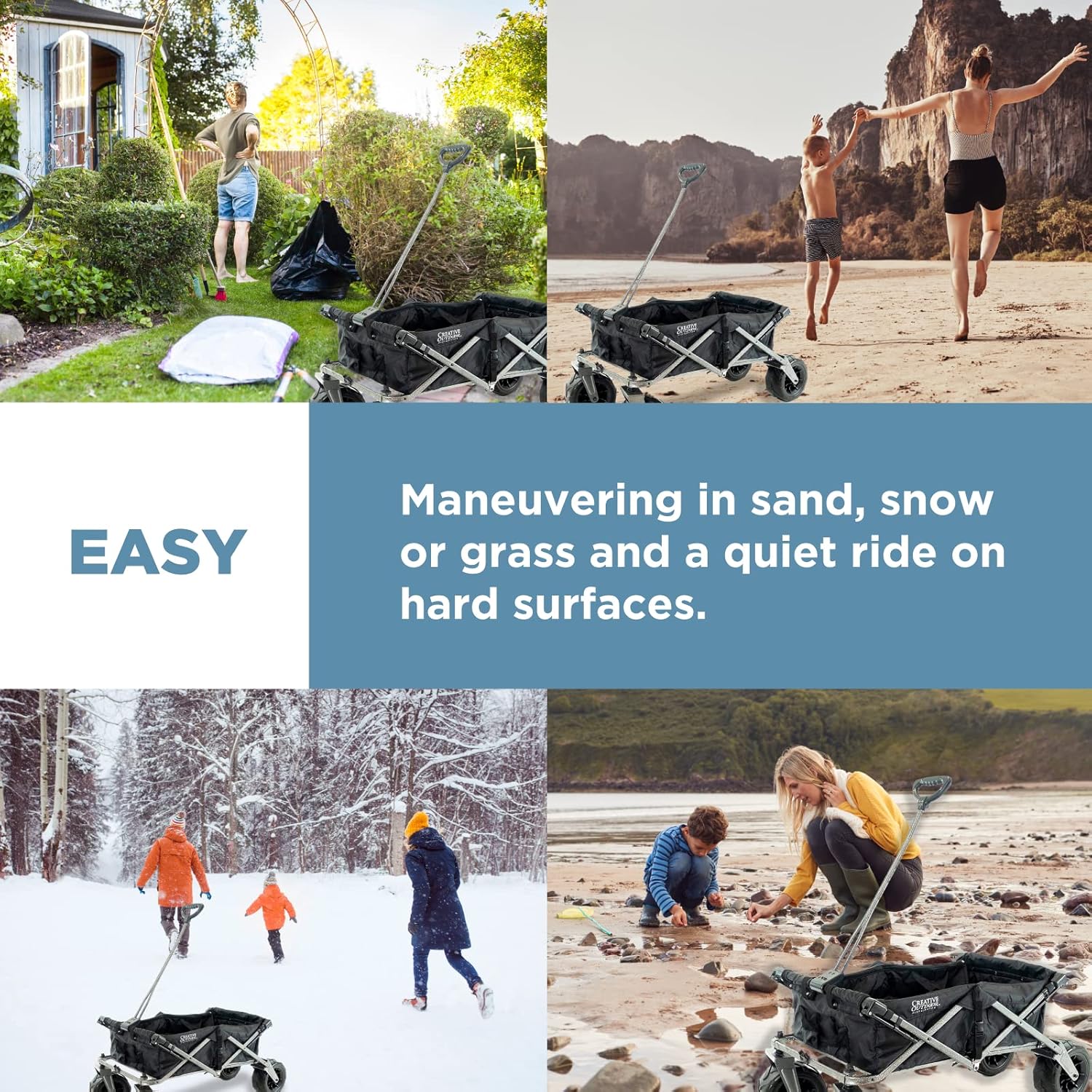 - HUGE RUBBER ALL-TERRAIN WHEELS - Comes equipped with ball bearings for decreased rolling resistance and increased load capacity. You can smoothly glide across many surfaces including grass, dirt, concrete, pavement, sandy beaches, and more! The front wheels swivel 360 degrees to allow a tight turning radius and easily maneuver around obstacles and navigate the terrain. The bigger wheels dampen the bumps in your path so the precious cargo and passengers experience a smooth ride.
