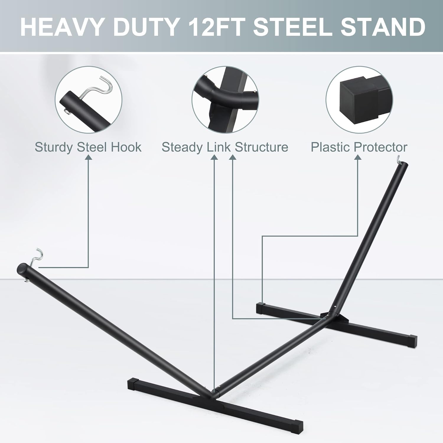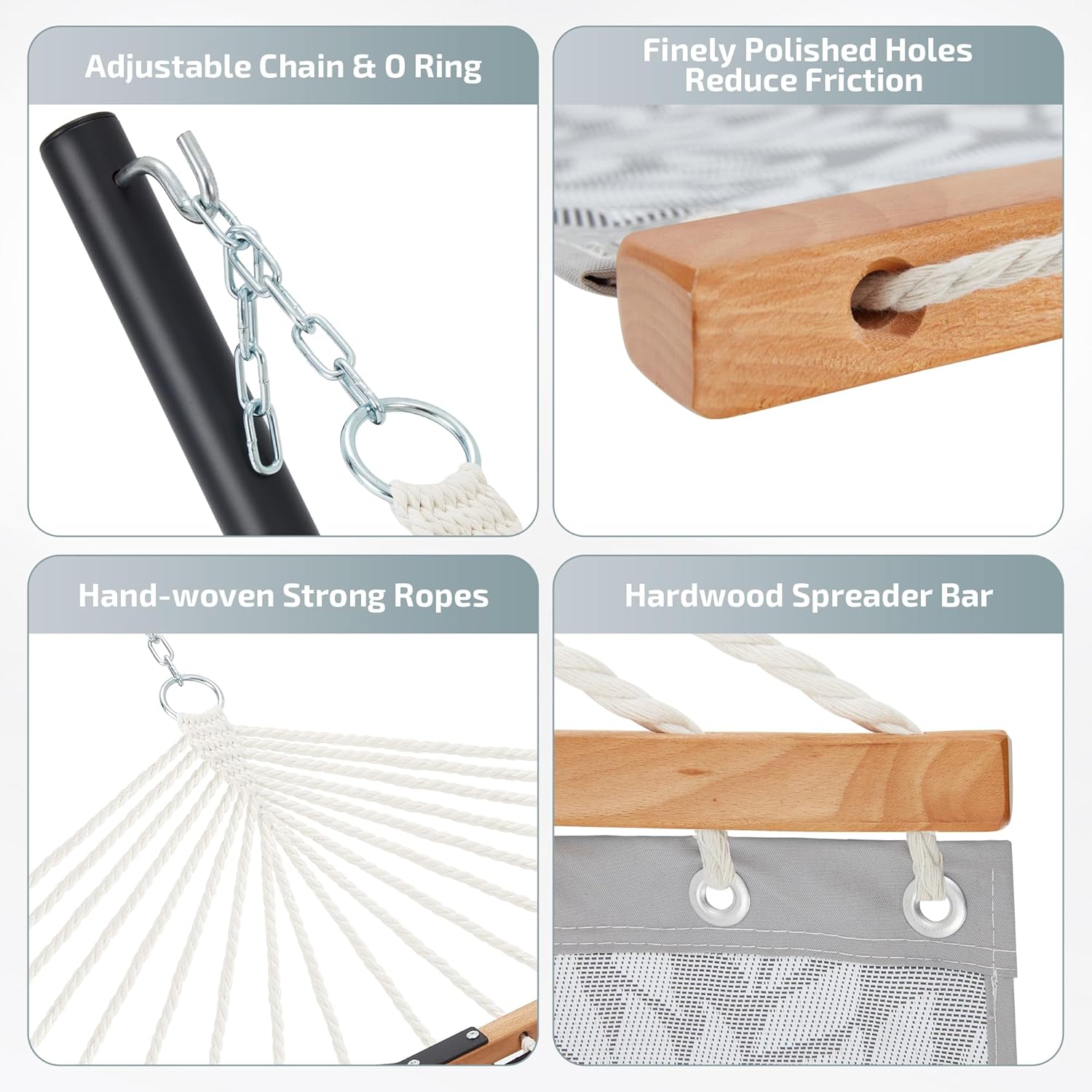Two Person Hammock with Stand Heavy Duty, Outdoor Patio Hammock with Portable Steel Stand, Large Double Hammocks with Quick Dry Textilene Fabric,480lbs Capacity.(Grey White)