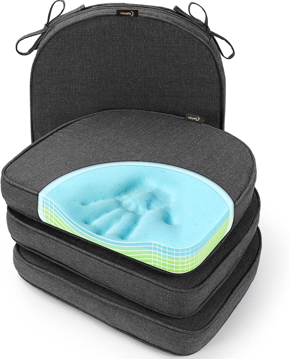 SUNROX Gel Memory Foam Chair Cushions, FadeShield Water-, Stain-Resistant Durable Reversible Seat Cushion Pads with Ties for Indoor/Outdoor Kitchen Dining Office 17"x16" Set of 4, Midnight