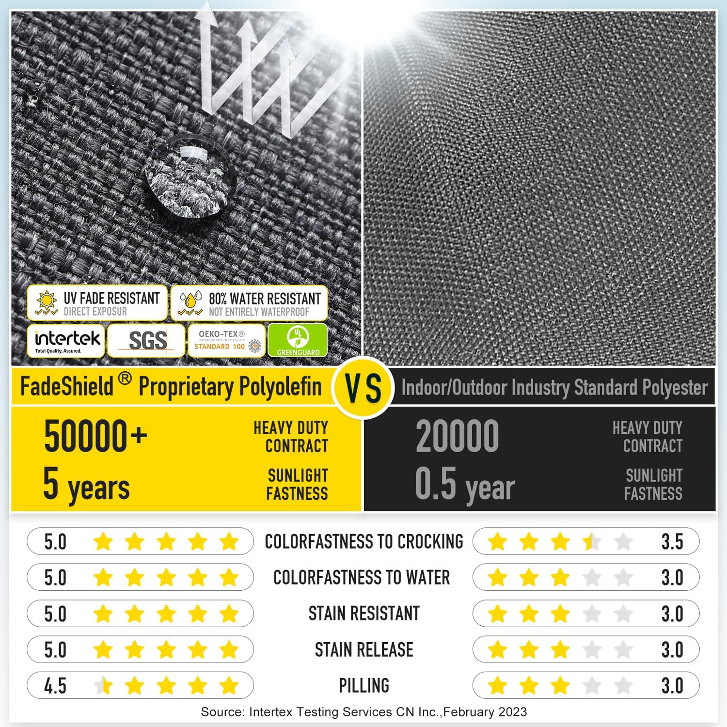 - 【FadeShield - UV Fade Resistant】FadeShield Proprietary Polyolefin are dependable indoor/outdoor performance fabrics, they are infused with antimiсrоbial silver Ion technology and can withstand 5 years of UV fade resistance, solution-dyed to make sure that each color is deeply ingrained in every fiber for continued vibrancy, even after heavy use. We recommend bringing it indoors when it rains or when not in use to preserve its lifespan and keep it looking beautiful.