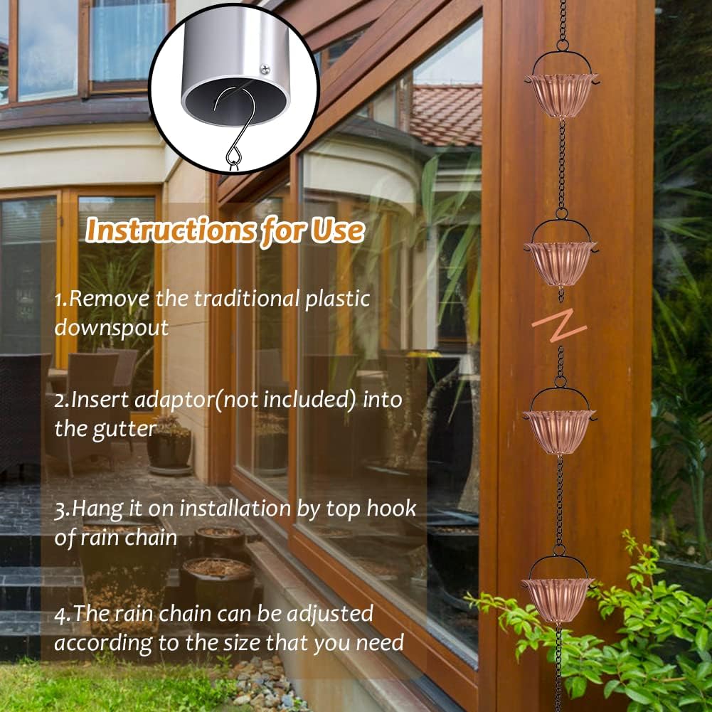- Easy to Install and Use: No assembly required, the rain chain for outside is designed with "S" shaped hooks, simply hang the hooks on the adapter , it can be used to hang under the eaves. The length of the metal rain chain is adjustable, if the rain chain is too long, can use a tool to remove the chain
