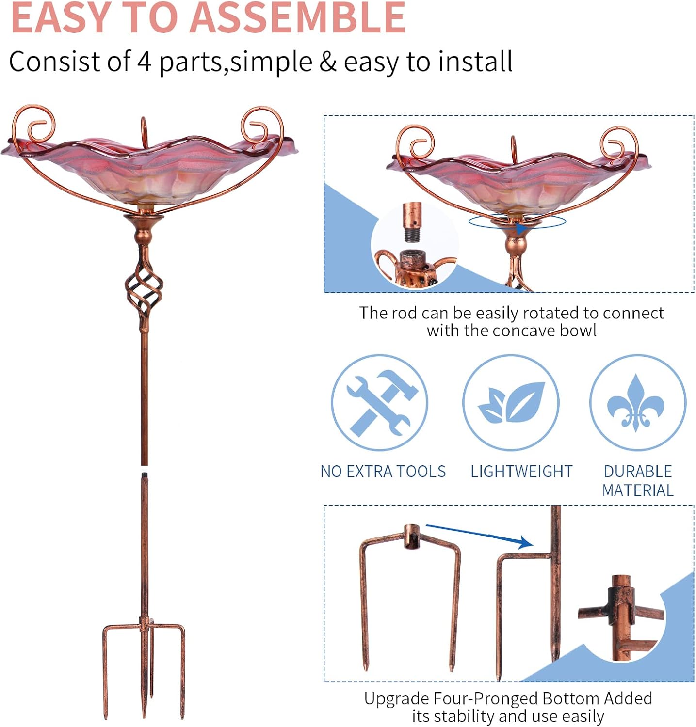 - 【Glass Bird Bath】This garden bird bath is easy to assemble; birdbath base is a four-pronged bottom, which increases the stability of the bird bath and you can effortlessly move this bird bath bowl to the perfect place for garden decor