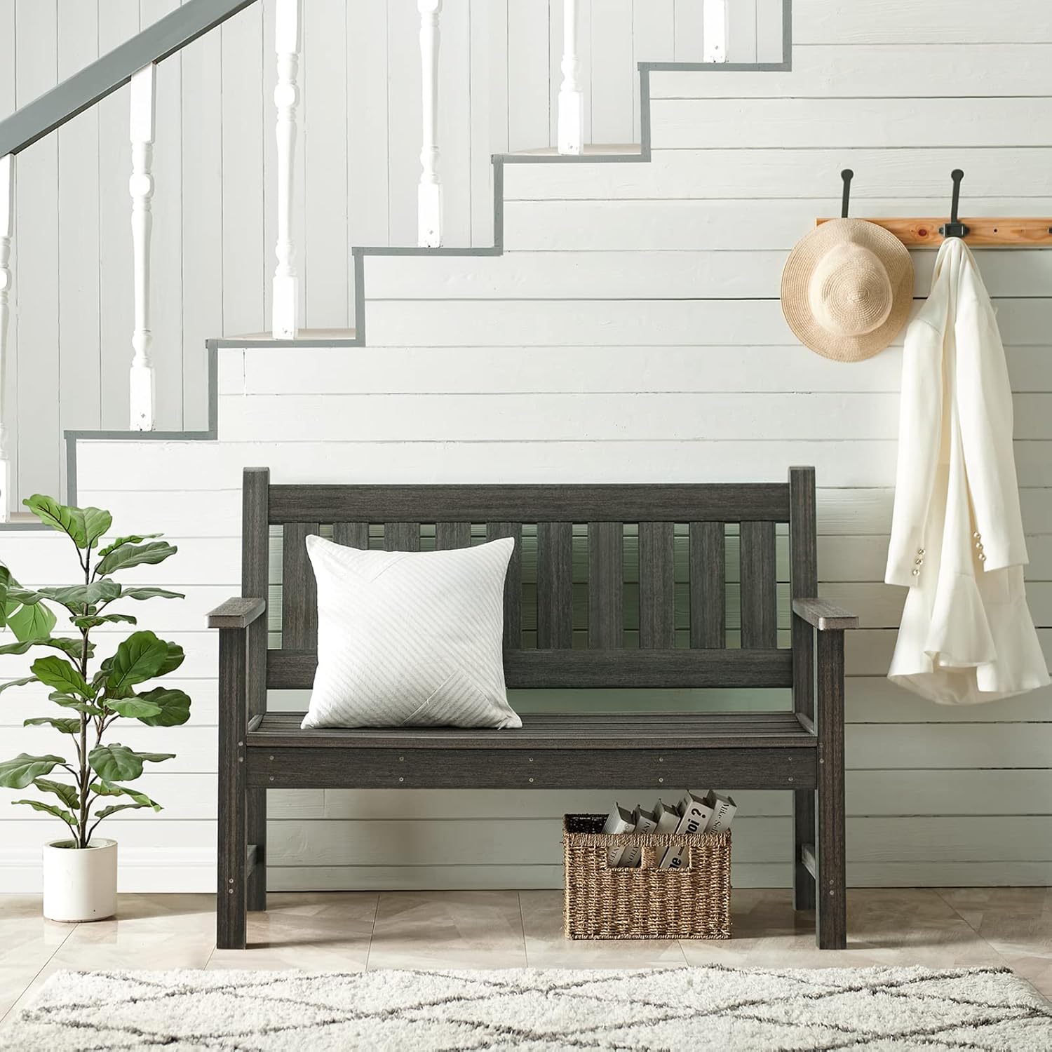 - ăEasy to AssembleăThe outdoor bench comes with 4 pre-assembled boards, making the assembly easier. You only need to screw 8 identical screws into the pre-drilled holes. In addtion, it's worth noting that the porch bench is heavy. (It is recommended that 2 people install it together.)