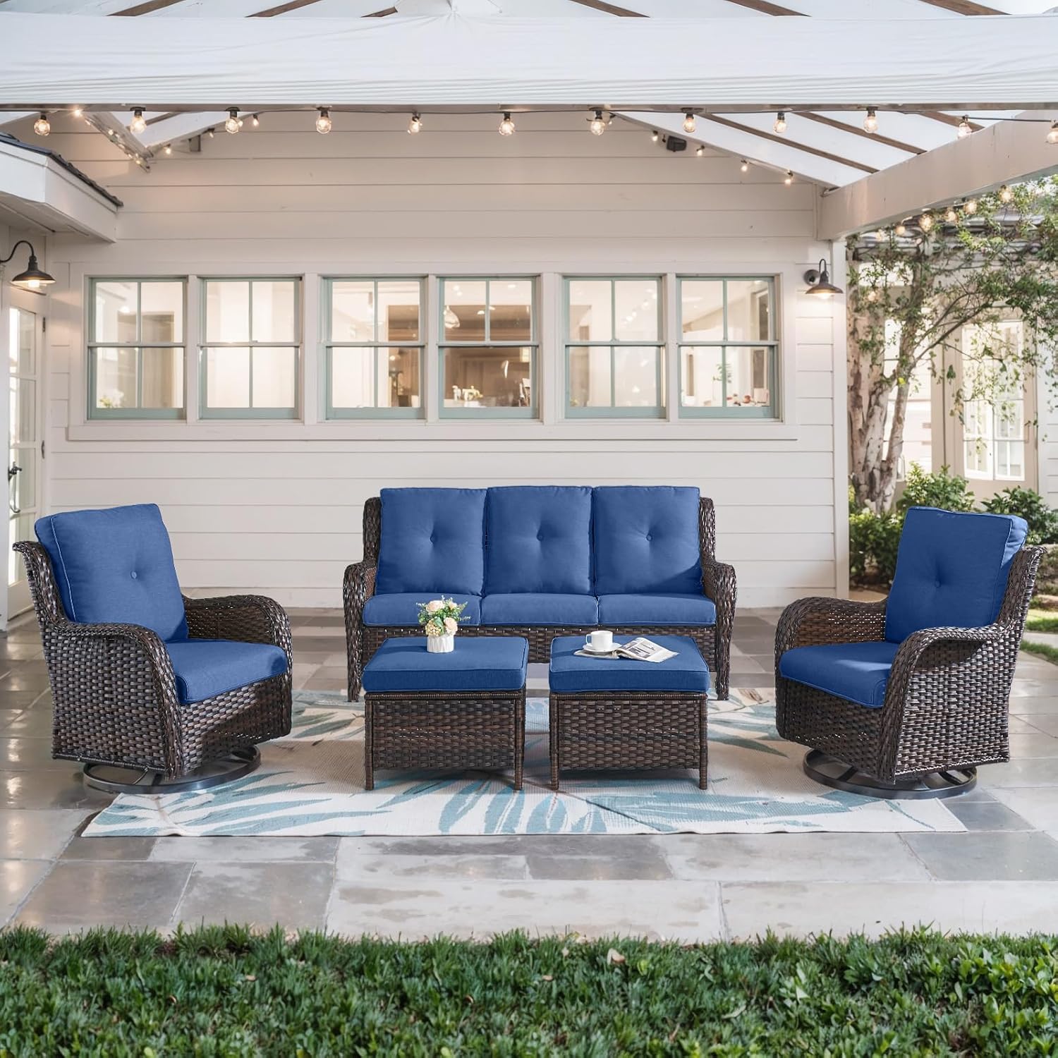5 Piece Outdoor Patio Furniture Set - Wicker Furniture Patio Conversation Set, Outdoor Swivel Rocker Chairs with 3-Seater Sofa and 2 Ottomans for Small Space, Blue Cushion