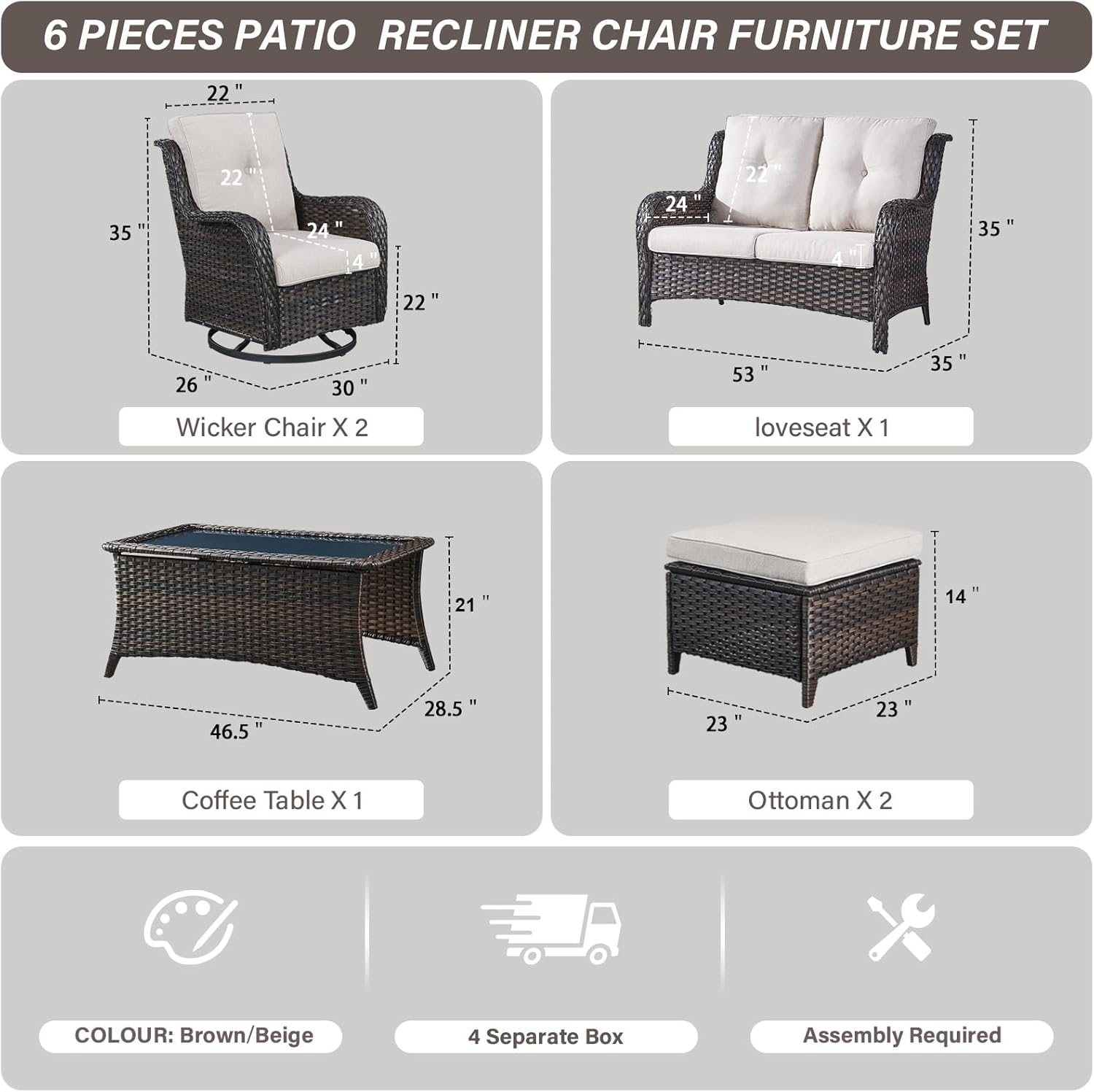 Wicker Outdoor Furniture Patio Furniture Set - 6 Piece Patio Conversation Set with Swivel Rocker Chairs, Loveseat Sofa, Ottomans and Coffee Table, Beige Cushion