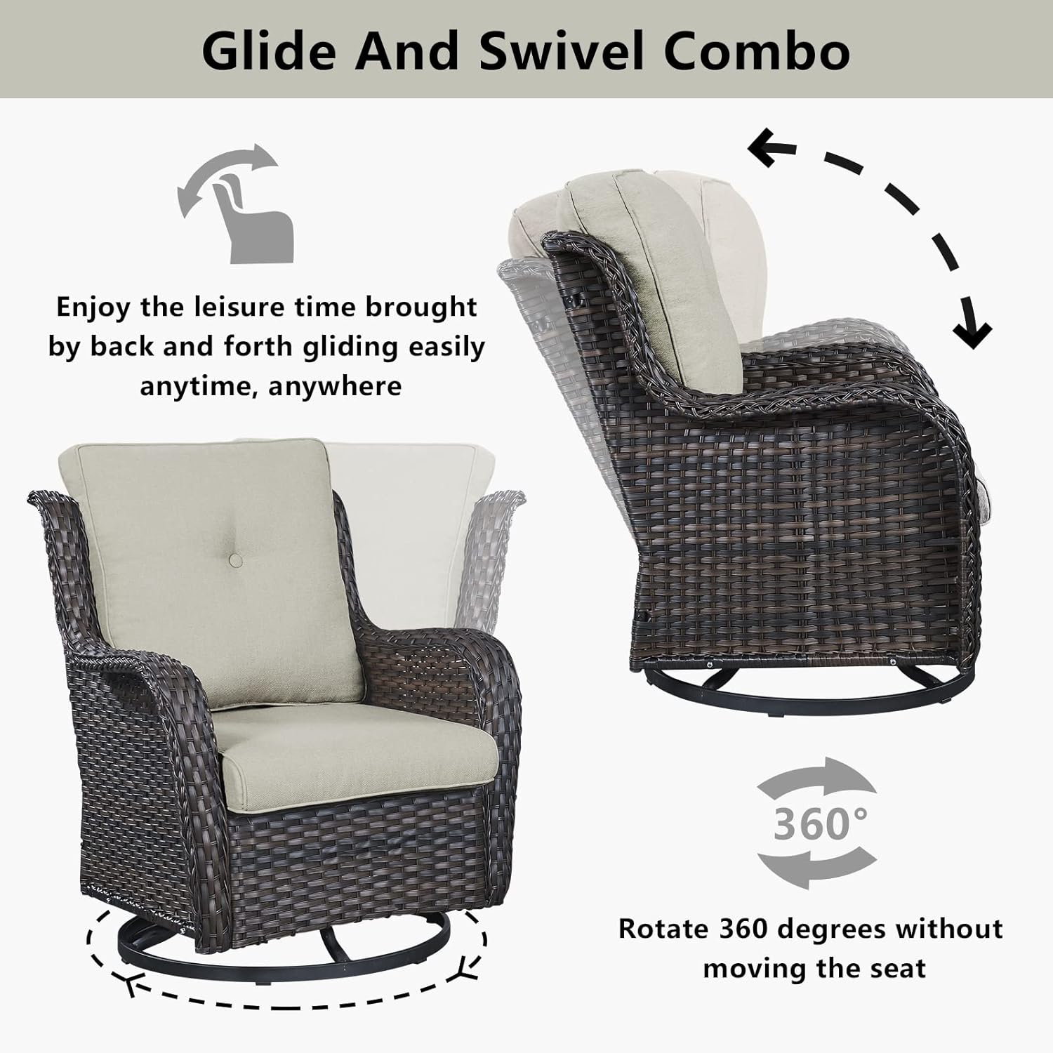 - Comfortable And Easy To Clean: Each glider chair and sofa in this outdoor set comes with a 4-inch thick foam seat cushion and an 8-inch thick cotton back cushion, which is ergonomic and enhances the overall comfort of the chair. The chair cushion cover is made of outdoor professional olefin fabric which is water resistant, and the seat cushion is equipped with zippers that are removable and easy to clean.