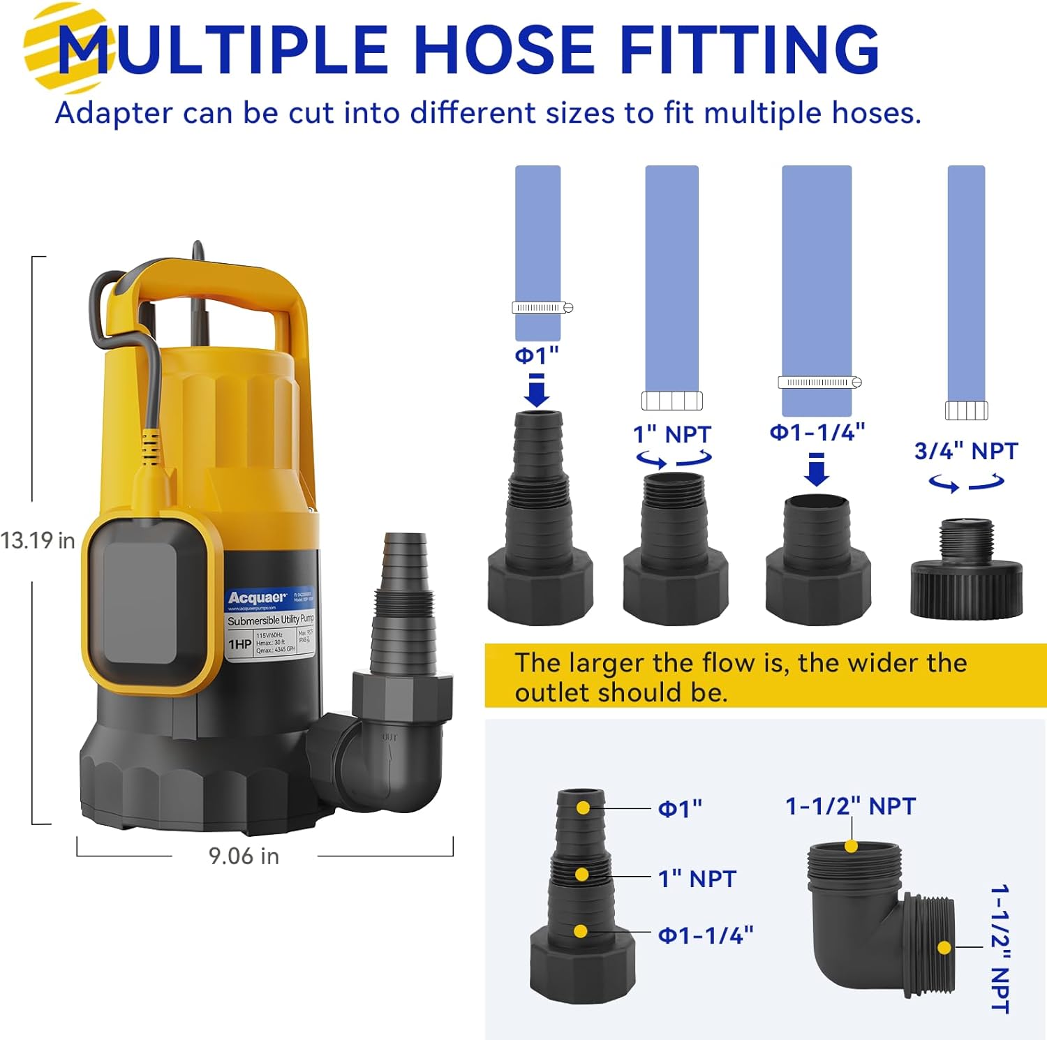 Acquaer 1HP Utility Pump 4345GPH Submersible Sump Pump with Automatic Float Switch, Water Removal for Hot Tub, Pools, Basements, Garden Pond