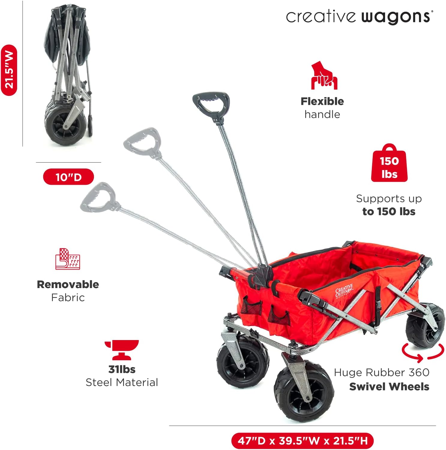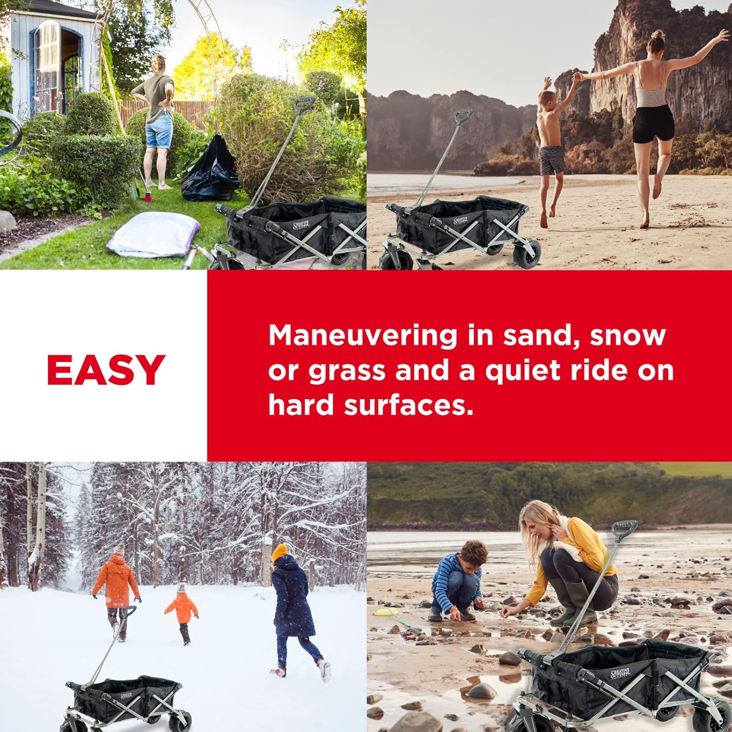- HUGE RUBBER ALL-TERRAIN WHEELS - Comes equipped with ball bearings for decreased rolling resistance and increased load capacity. You can smoothly glide across many surfaces including grass, dirt, concrete, pavement, sandy beaches, and more! The front wheels swivel 360 degrees to allow a tight turning radius and easily maneuver around obstacles and navigate the terrain. The bigger wheels dampen the bumps in your path so the precious cargo and passengers experience a smooth ride.