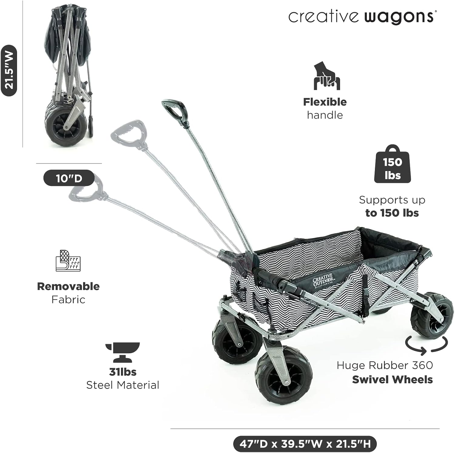 - HUGE RUBBER ALL-TERRAIN WHEELS - Comes equipped with ball bearings for decreased rolling resistance and increased load capacity. You can smoothly glide across many surfaces including grass, dirt, concrete, pavement, sandy beaches, and more! The front wheels swivel 360 degrees to allow a tight turning radius and easily maneuver around obstacles and navigate the terrain. The bigger wheels dampen the bumps in your path so the precious cargo and passengers experience a smooth ride.