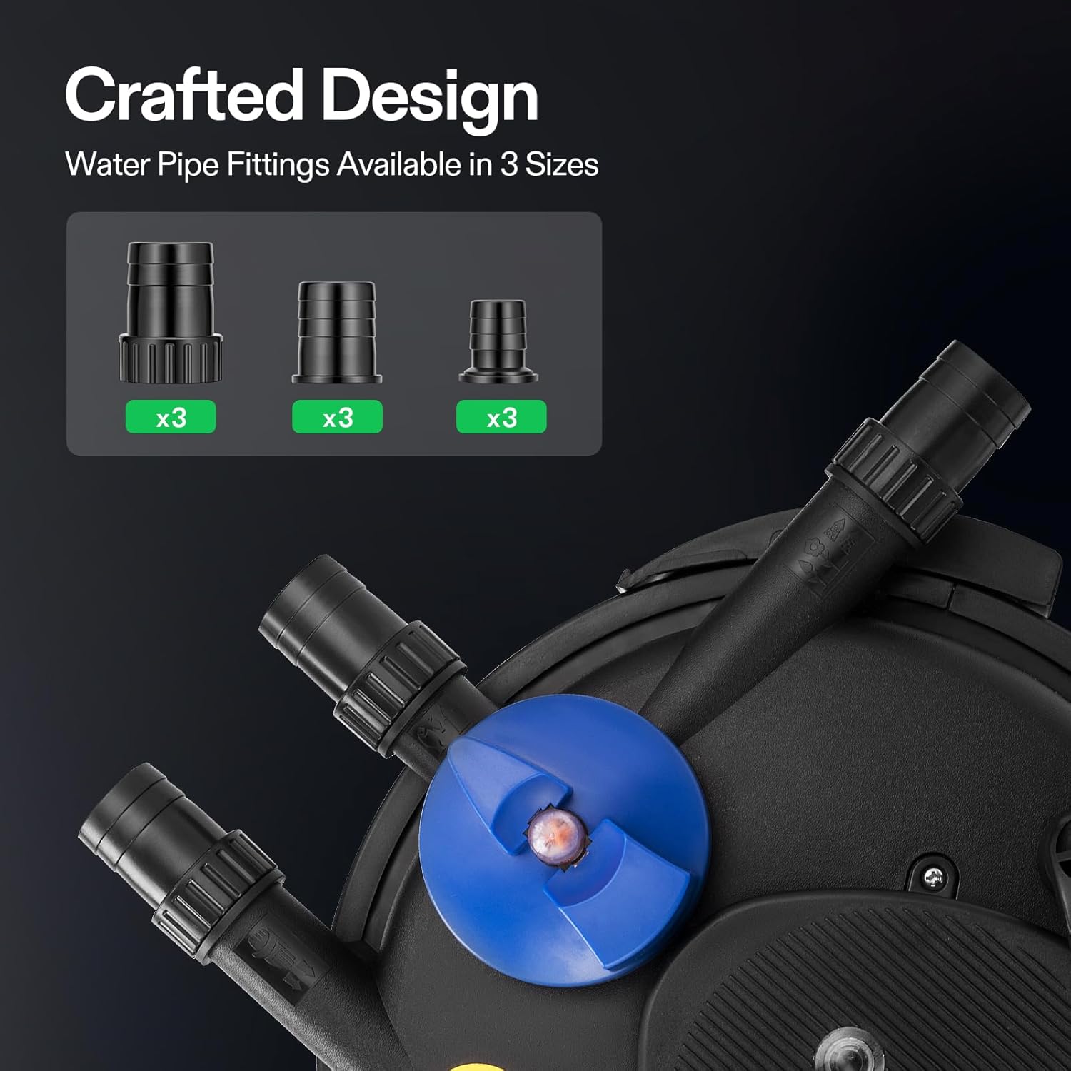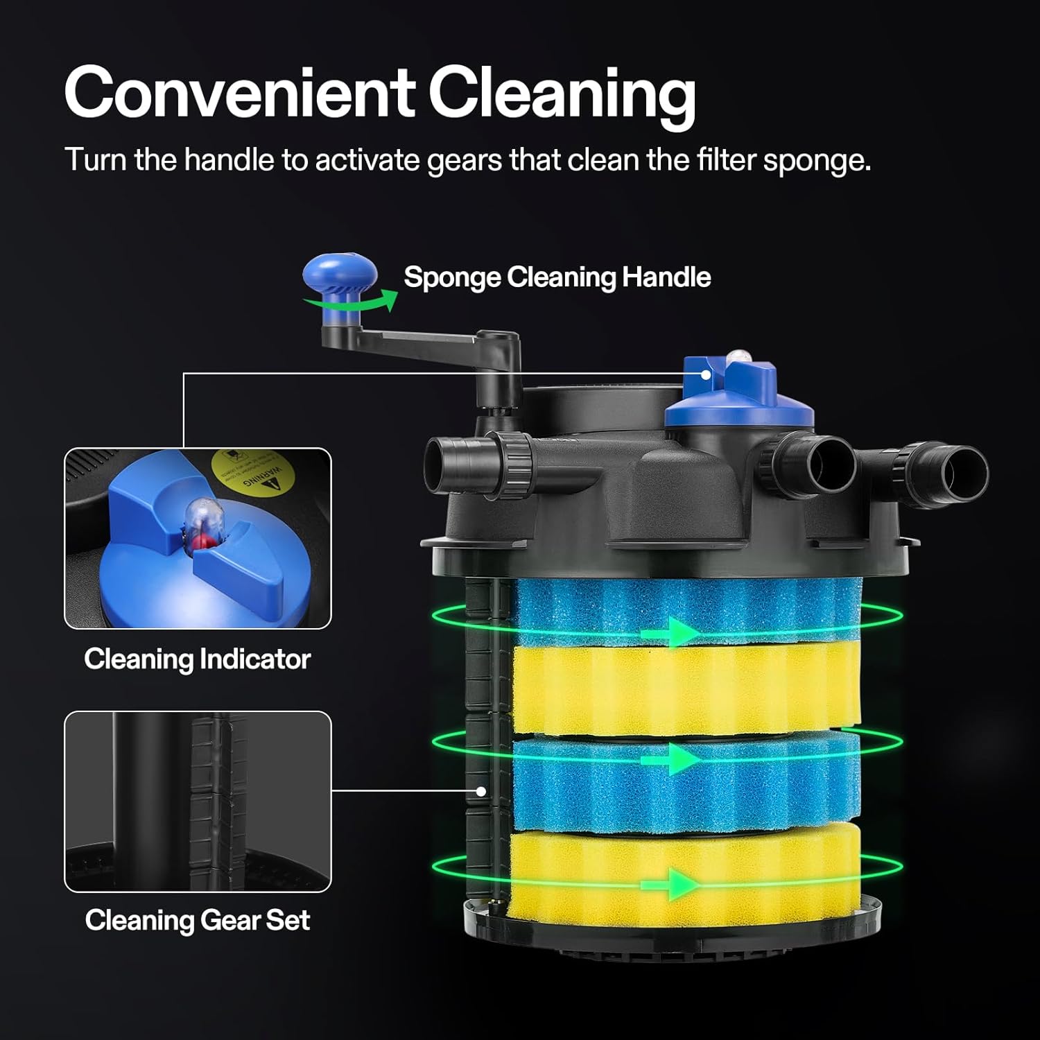 - Easy to Use: Installation is simple and the device can be installed on land or in water and then install the filter material and accessories on the filter; The top switch can be easily rotated to drain through both ports so you can adjust it according to your needs