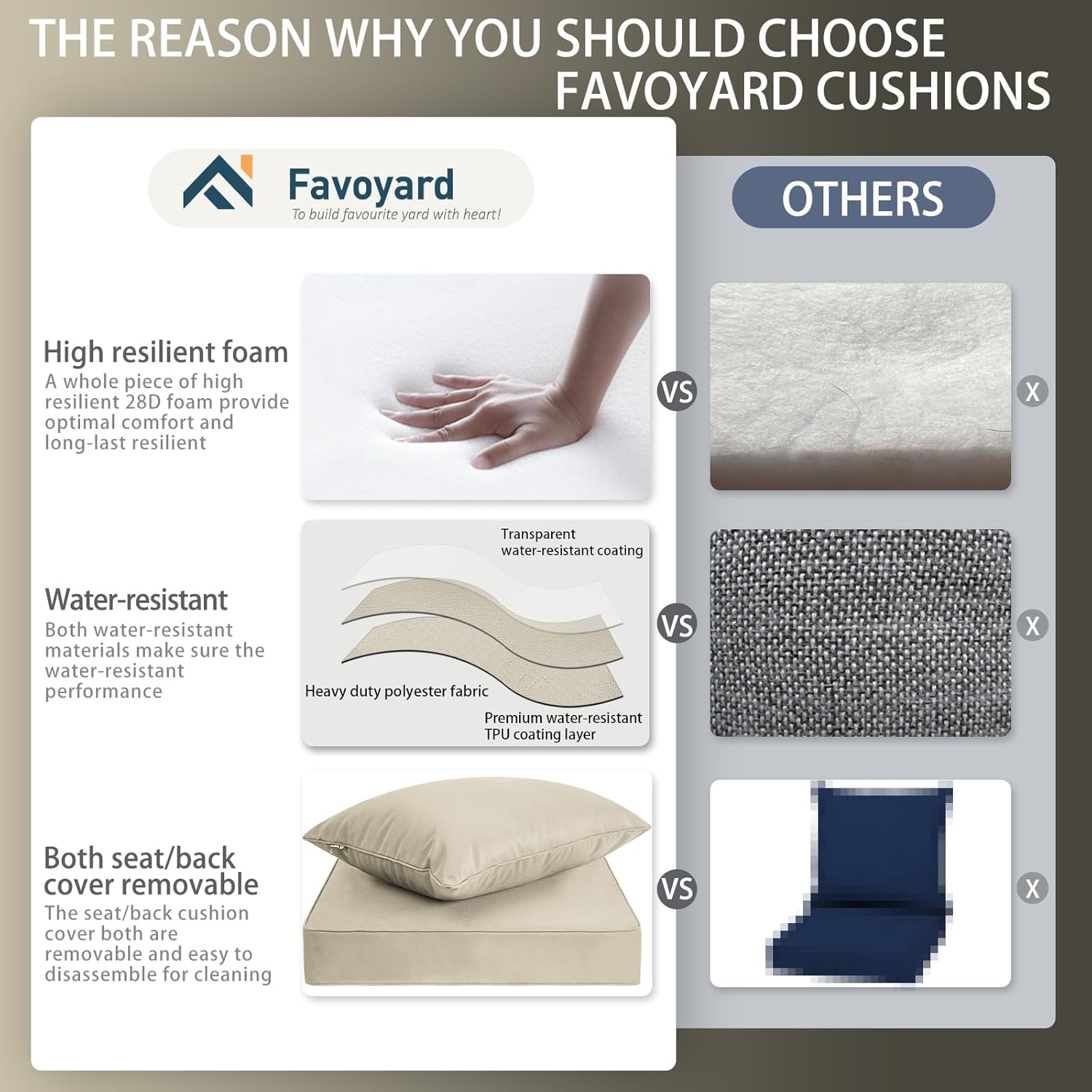 - Favoyard outdoor patio cushions feature a 300GSM high-density polyester cover, designed to deliver excellent water-resistant performance. The fabric is lined with a TPU coating on the reverse side, also working for enhancing waterproofing capabilities of the cover. However, it is still not recommended to use it in heavy rain or similar weather for a long time.