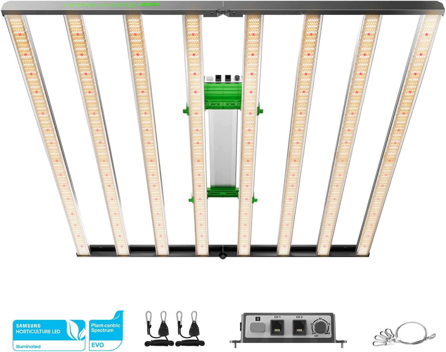 - FULL SPECTRUM GROW LIGHT: Mars Hydro FC1000W full spectrum bar style grow light features 650-665nm Rich Red IR, 3000Knm Warm White, and 5000 Knm white spectra, it has 8 light bars to provide excellent and powerful energy, ideal for cultivation during the blooming period or for cultivation supplemented by highly-concentrated CO2.
