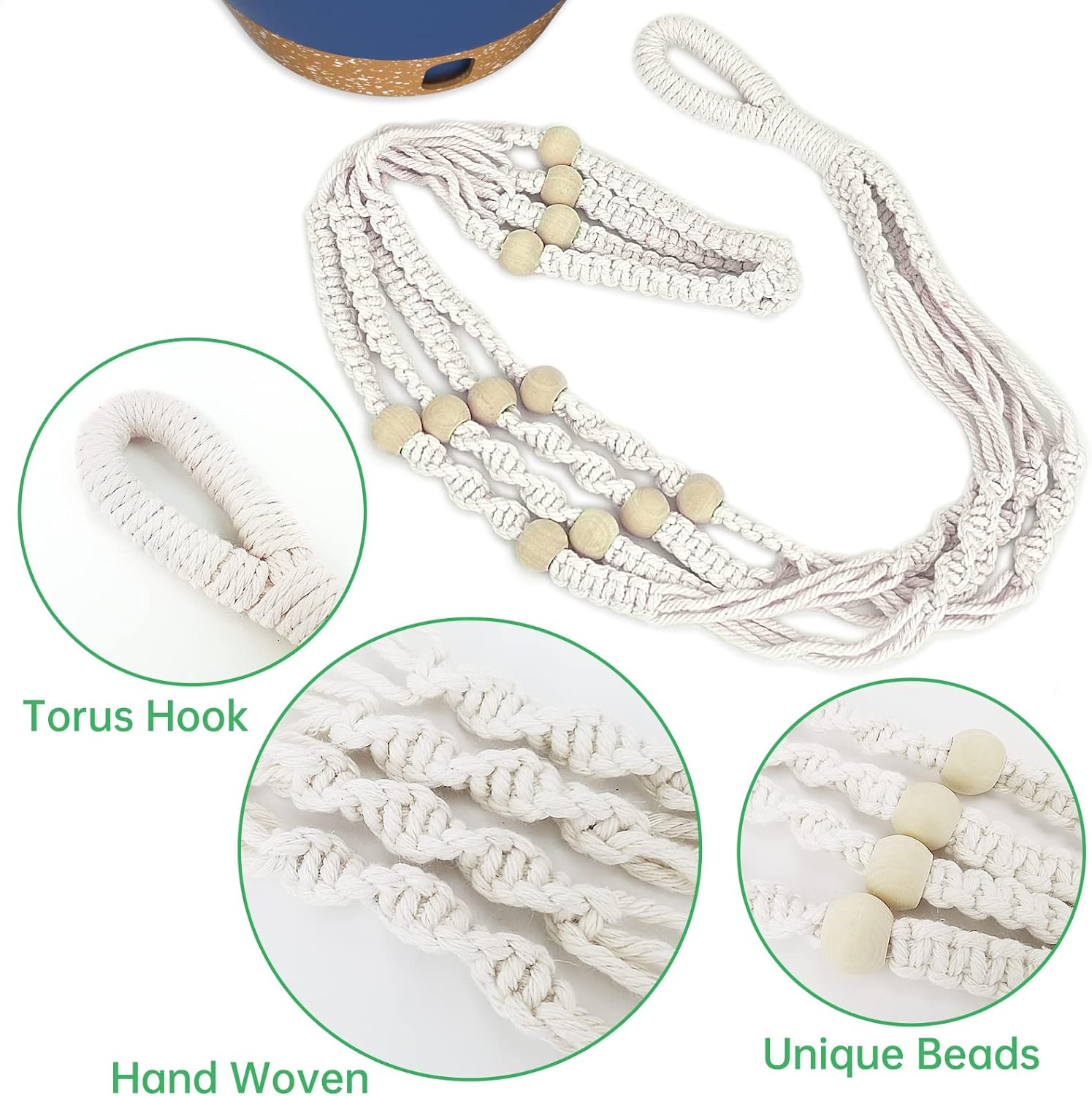 - Handmade Macrame Plant Hanger: The Hanging Planter Basket is made of 100% Pure cotton cord, high resistance to tearing and high safety. The unique beads makes the plant hanger more decorative and look good when hung.