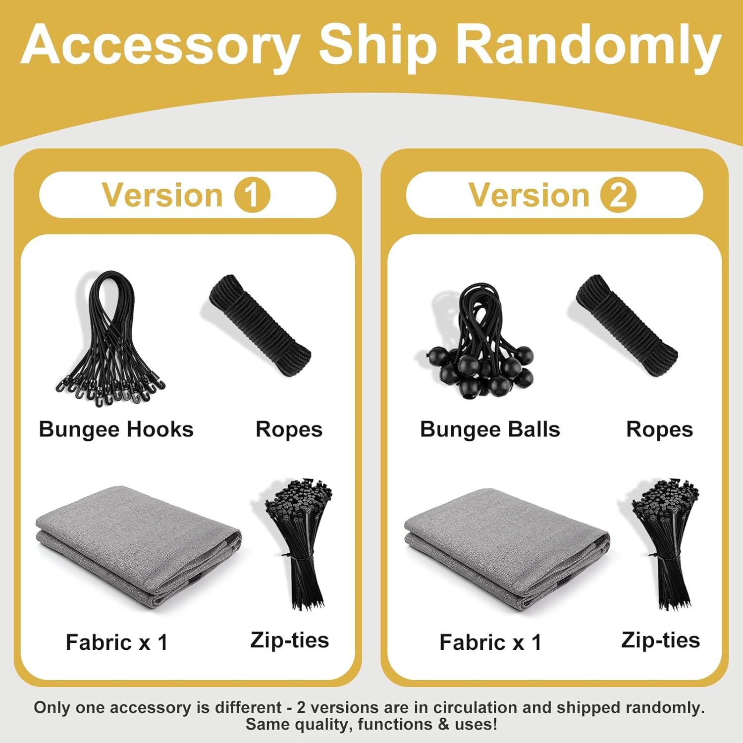 - Accessory Updated: Accessories have been updated from [Zip-ties, Ropes, Bungee Balls] to [Zip-ties, Ropes, Bungee Hooks]. Both versions are in circulation and will be shipped randomly. Easy to Install: With included grommets on each sides every 2 ft space and fixing accessories, you can easily attach the pergola shade cover to various structures while ensuring uniform stress. Whether you're looking to cover your backyard, carport, or playground, you can have it up and providing shade in no time