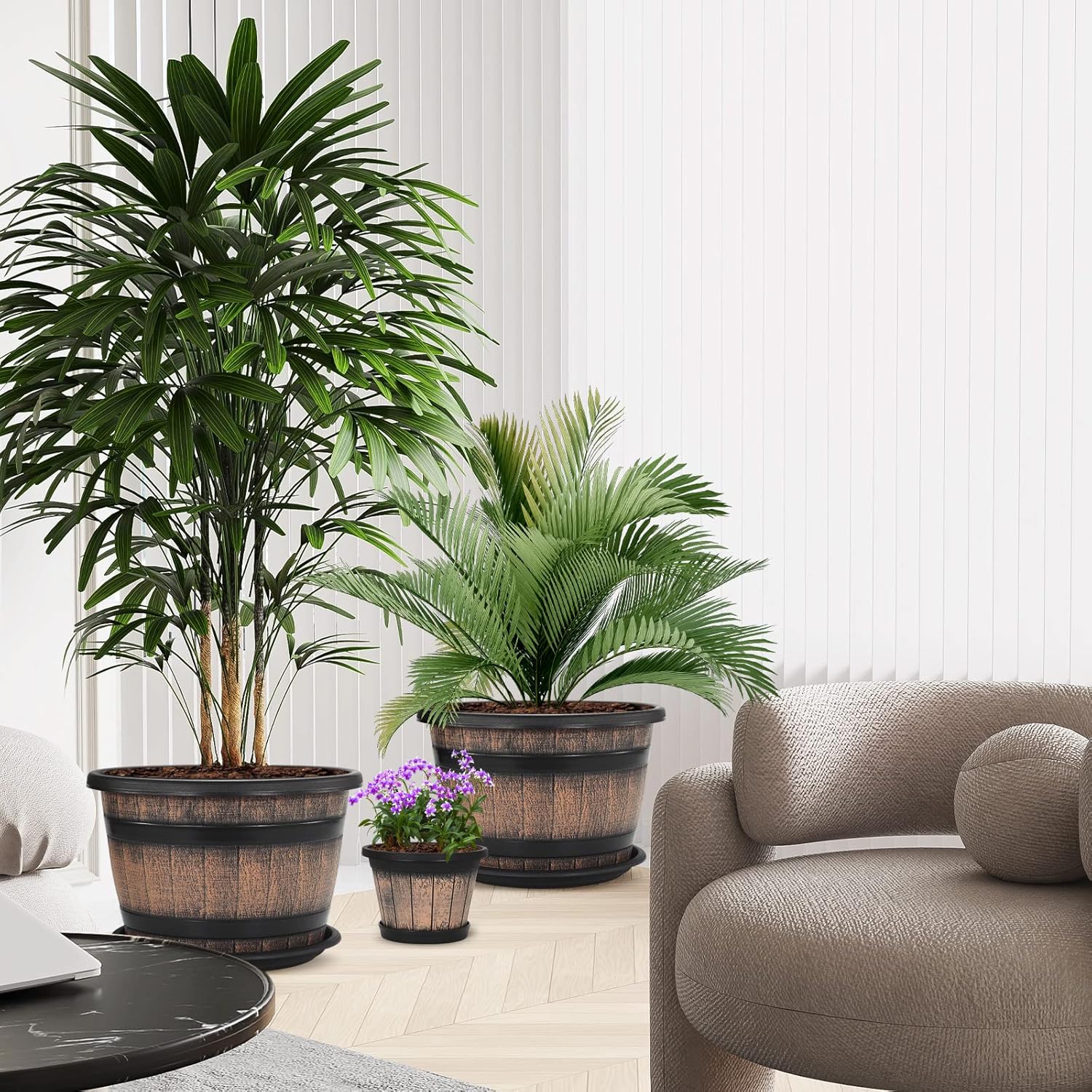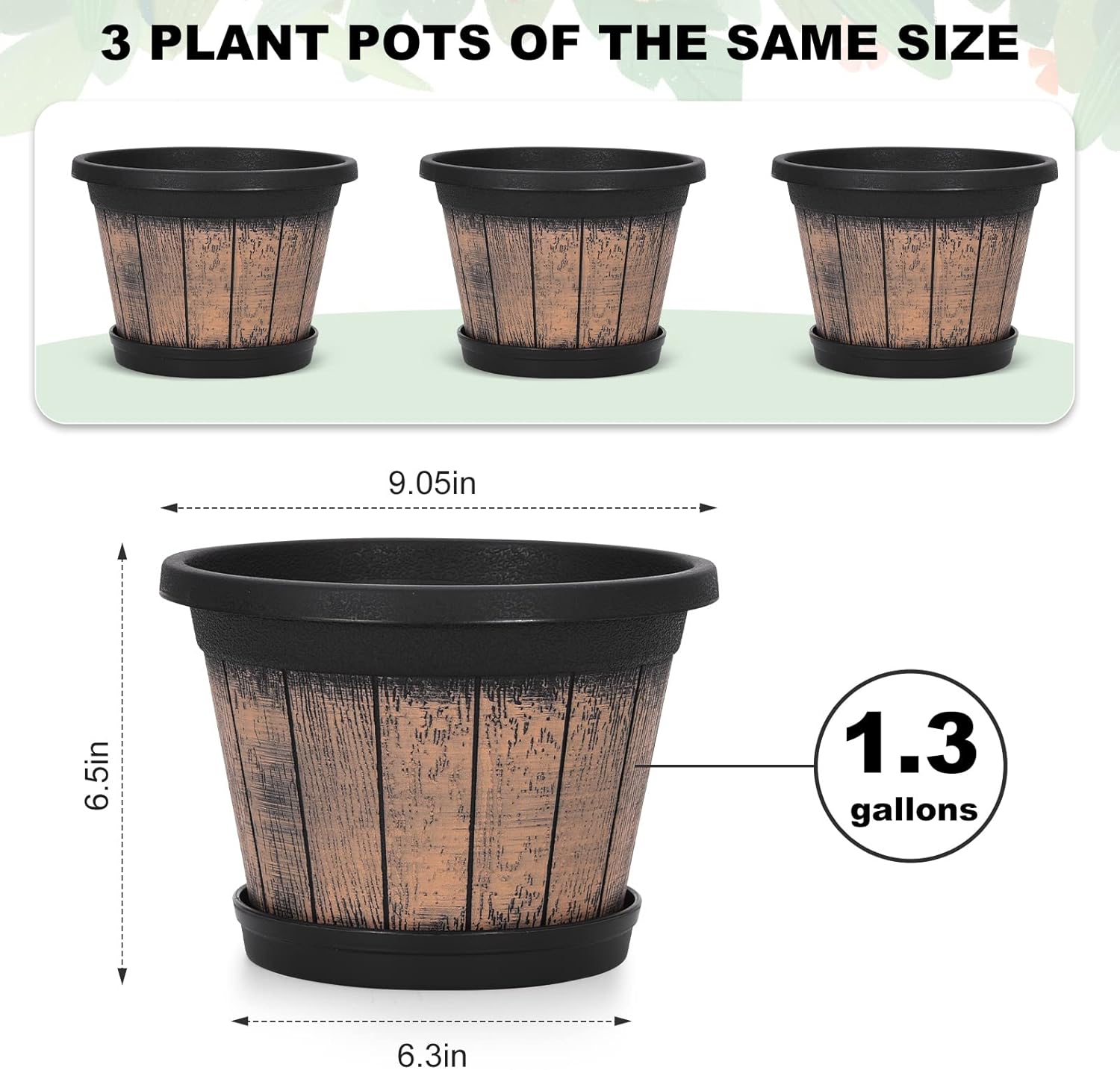 Quarut Plant Pots Set of 3 Pack 9 inch,Whiskey Barrel Planters with Drainage Holes & Saucer.Plastic Decor Flower Pots Imitation Wine Barrel Design,for Indoor & Outdoor Garden Home Plants (Brown)