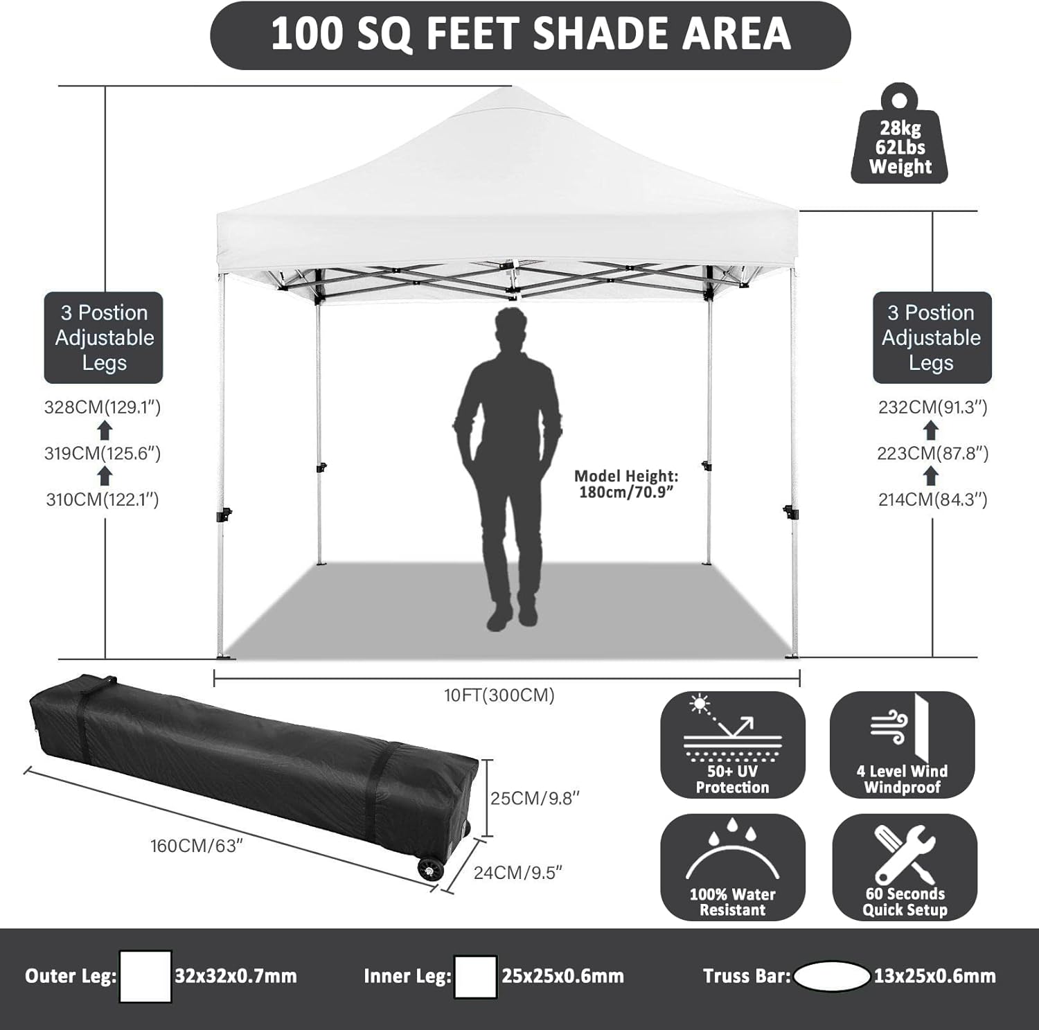 - 【3 Height Settings】10x10 pop up party tent straight leg has 3 height settings. Thumb latch lock system easy to lock and release, raise the pop up tent to a desired height. Canopy tent 10x10 straight leg height options: 214cm/84.3inch, 223cm/87.8inch, 232cm/91.3inch. Corresponding party tent center height options: 310cm/122.0inch, 319cm/125.6inch, 328cm/129.1inch. 10x10 canopy with sidewalls perfect for commercial activities, camping, festivals, tailgating, backyard events and etc..
