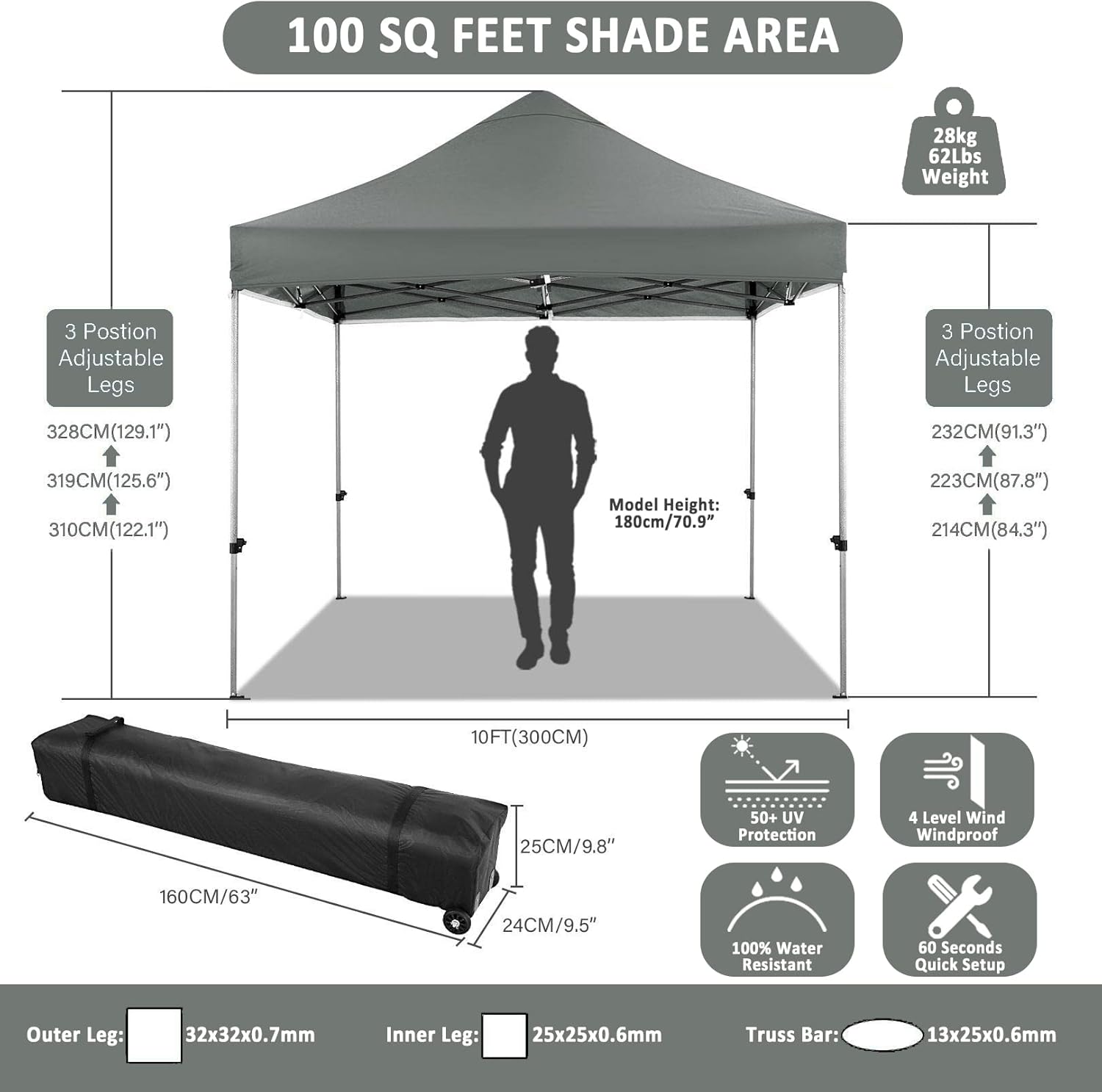 - 【3 Height Settings】10x10 pop up party tent straight leg has 3 height settings. Thumb latch lock system easy to lock and release, raise the pop up tent to a desired height. Canopy tent 10x10 straight leg height options: 214cm/84.3inch, 223cm/87.8inch, 232cm/91.3inch. Corresponding party tent center height options: 310cm/122.0inch, 319cm/125.6inch, 328cm/129.1inch. 10x10 canopy with sidewalls perfect for commercial activities, camping, festivals, tailgating, backyard events and etc..