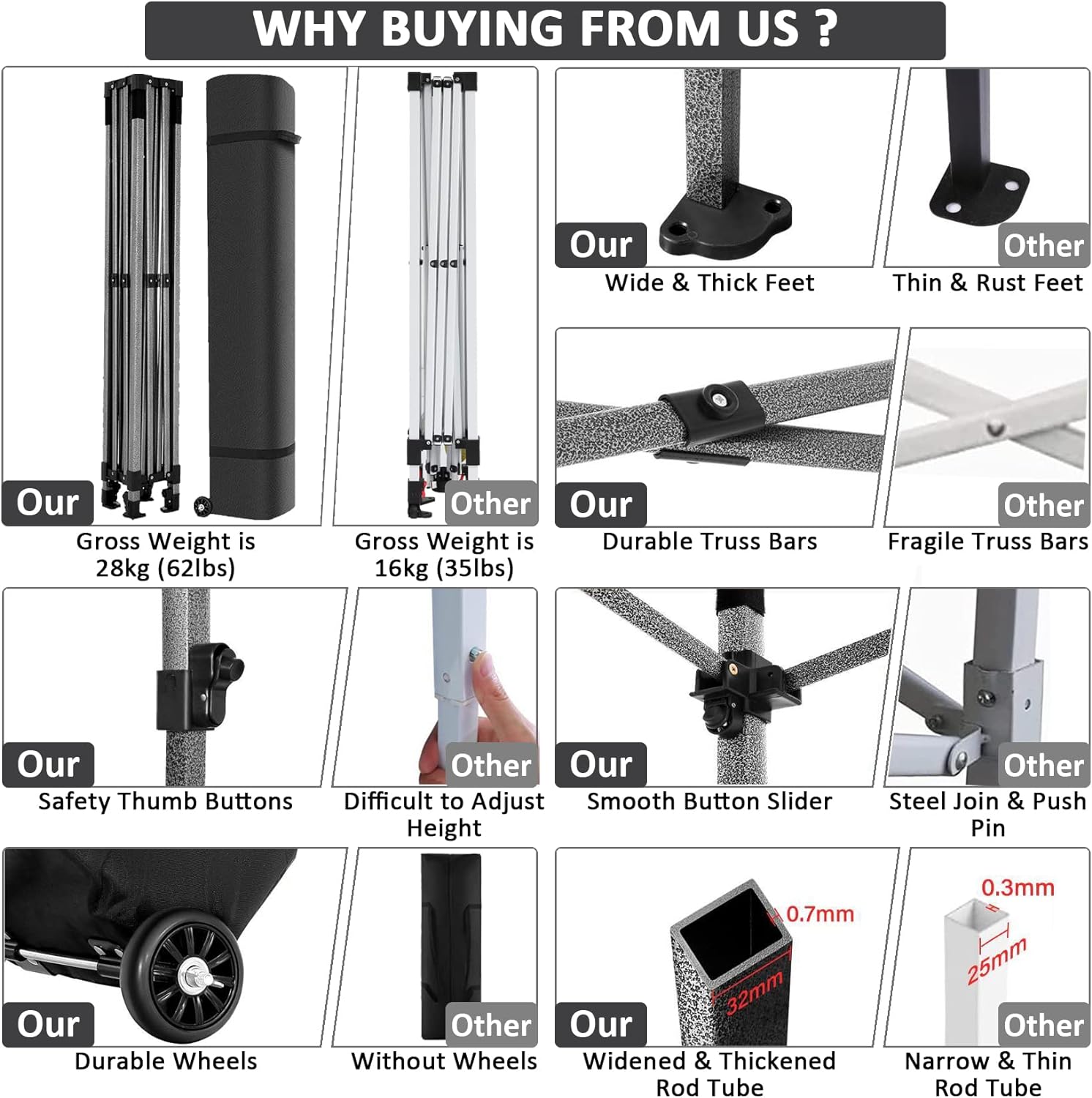 - 【Heavy Duty Alloy Steel Frame】The upgraded 10x10 commercial pop up canopy tent frame can hold up to 220 lbs (100 kg) on a single pole. The frame can hang 5 adults at the same time! Can withstand 4 winds.(<18 mph). 10x10 party tent with an upgraded alloy steel full truss structure, and reinforced plastic parts at the stress points at the intersection of the peaks and poles. 10x10 heavy duty canopy frame with powder coated coating guarantees rust resistance and corrosion resistance.