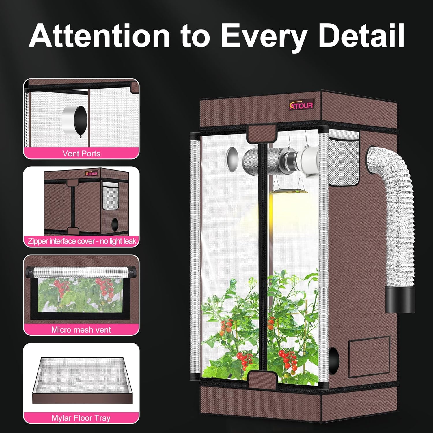 - Easily Observe Your Plants: The high reflective grow tent has a double-door design, the first layer of doors is 99% light-proof, effectively blocking all light. The second layer of transparent sealed door, zips open easily, allowing you to easily peek inside without opening the door frequently. The waterproof tray keeps your floor away from leaks.